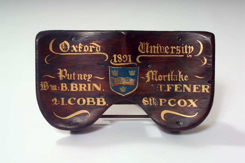 A wooden rowing seat painted with a crest and inscribed 'Oxford University 1891 Putney Mortlake', with the names of four oarsmen, 33cm (13in) wide.