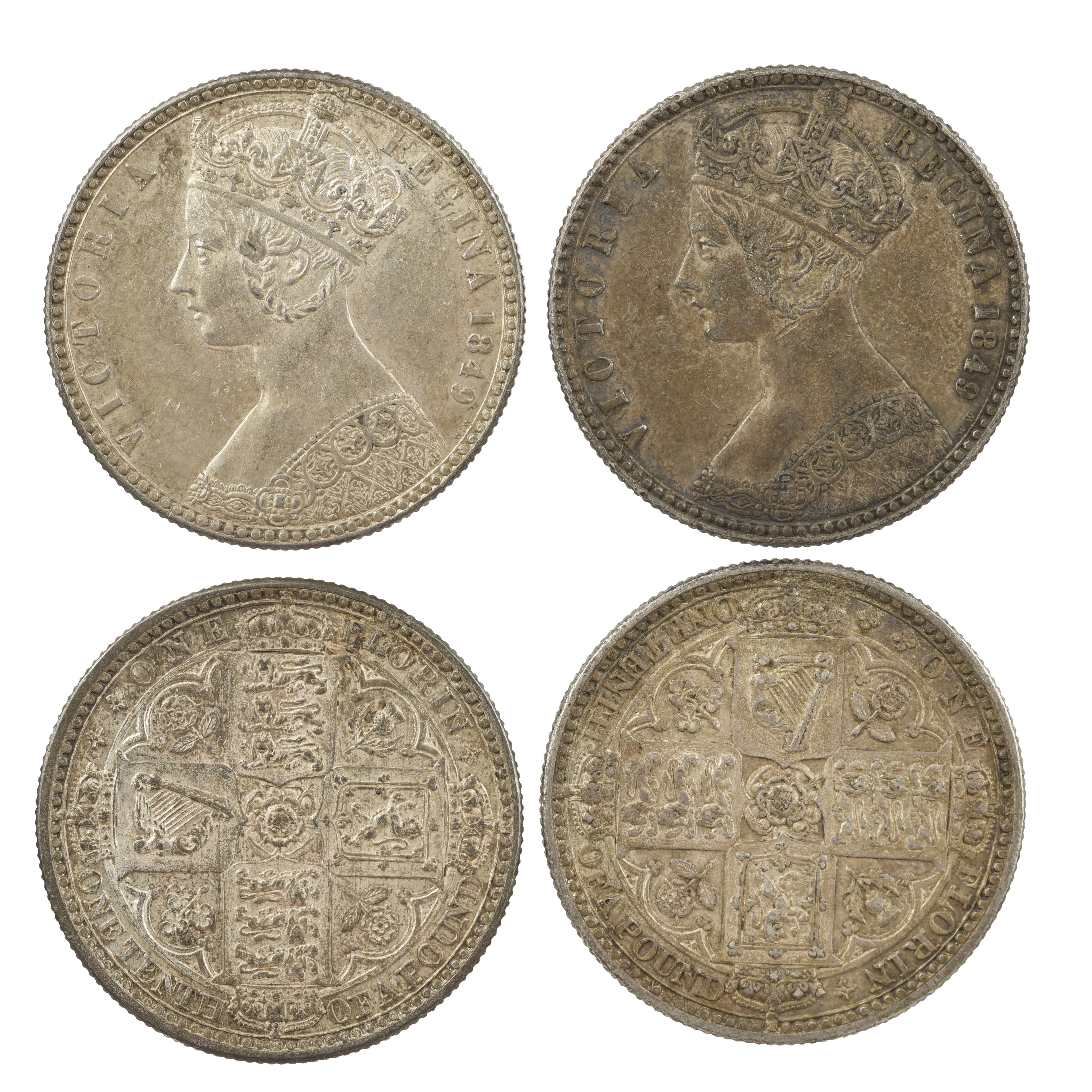 Victoria: silver florins (2), 1849, 'Godless' type, with initials (S 3890), good very fine or a little better, one toned. [2]