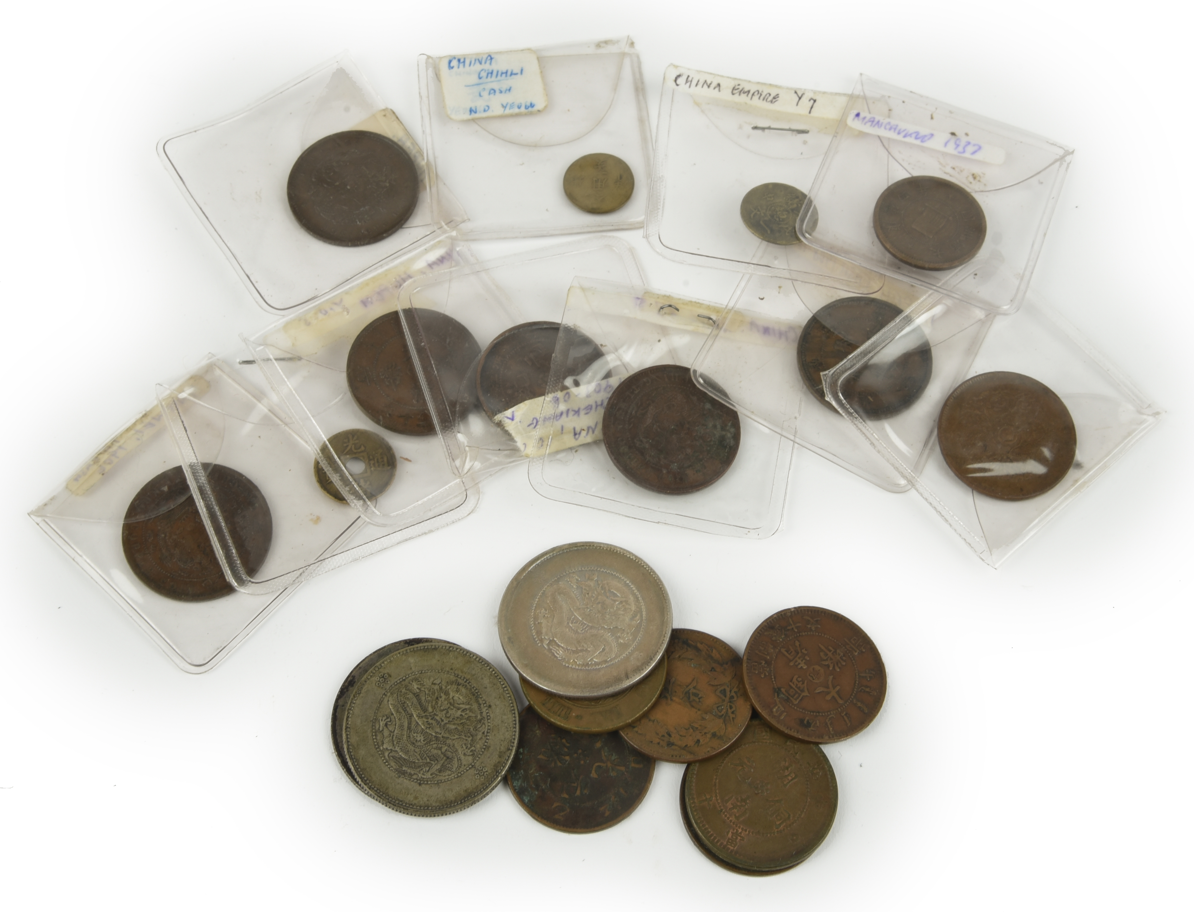 China: a small quantity of coins, including: Empire, standard unified coinage, brass cash (Y 7), near very fine; Republic: Yunnan, fifty cents (3), re-struck imperial coinage, Yunnan Sheng zao(Yün-nan Sheng Tsao), rev. dragon with two circles below pearl (KM Y257), two tarnished, all about very fine; Kiang-Nan, copper ten cash, very fine; Anhwei, copper ten cash, 1906, near very fine; and various others, in middle to high grades. [qty]