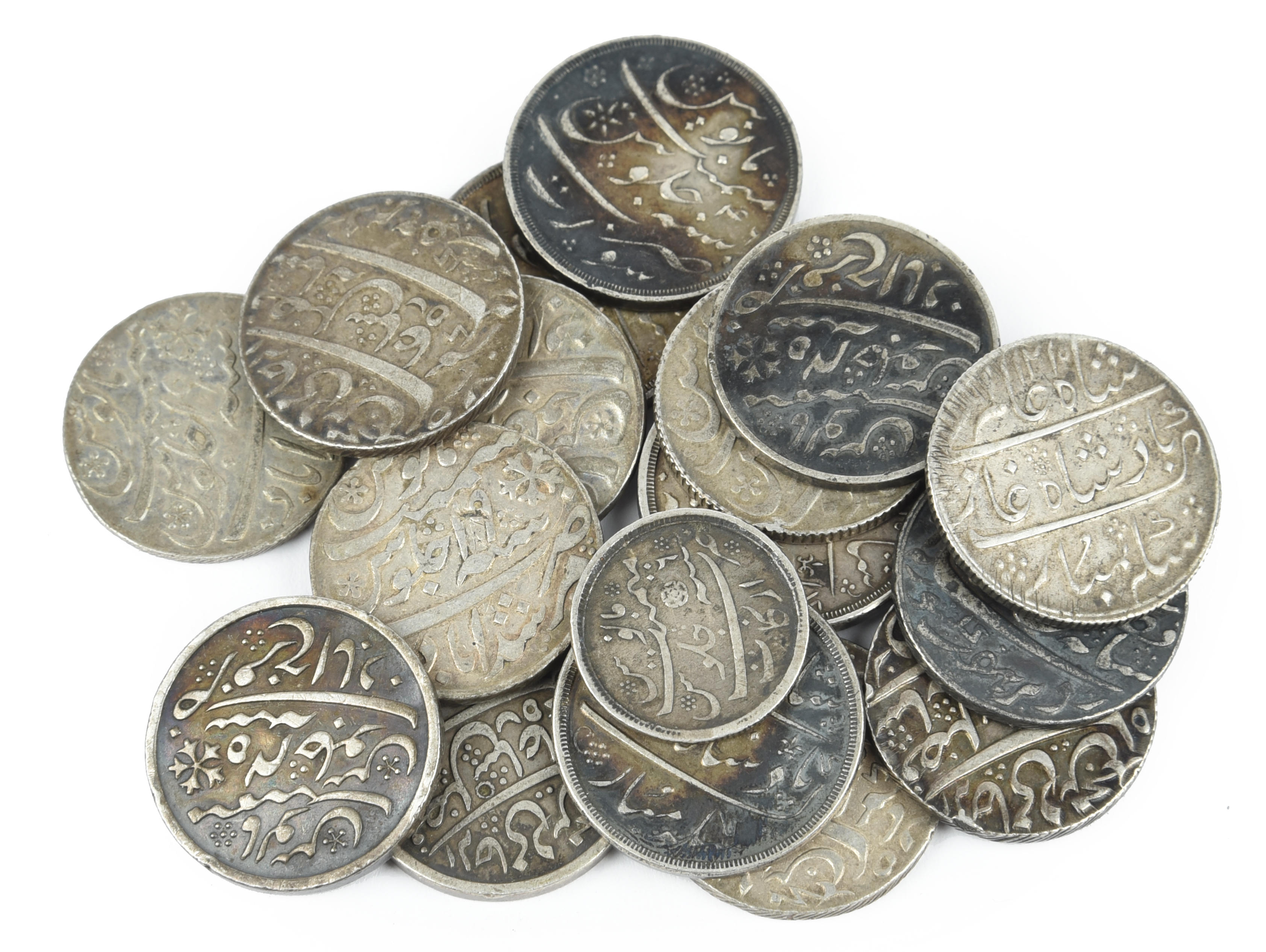 British India: a quantity of silver rupees, including: Bengal Presidency: ND (2), Farrukhabad mint (KM 70), very fine ; Bombay Presidency: AH1215, reeded edge (KM 221), near very fine; Bombay Presidency, AH1215 (5), plain edge, Surat mint (KM 224), good very fine or a little better; and others similar including a half rupee, AH1172, very fine and better. [18]