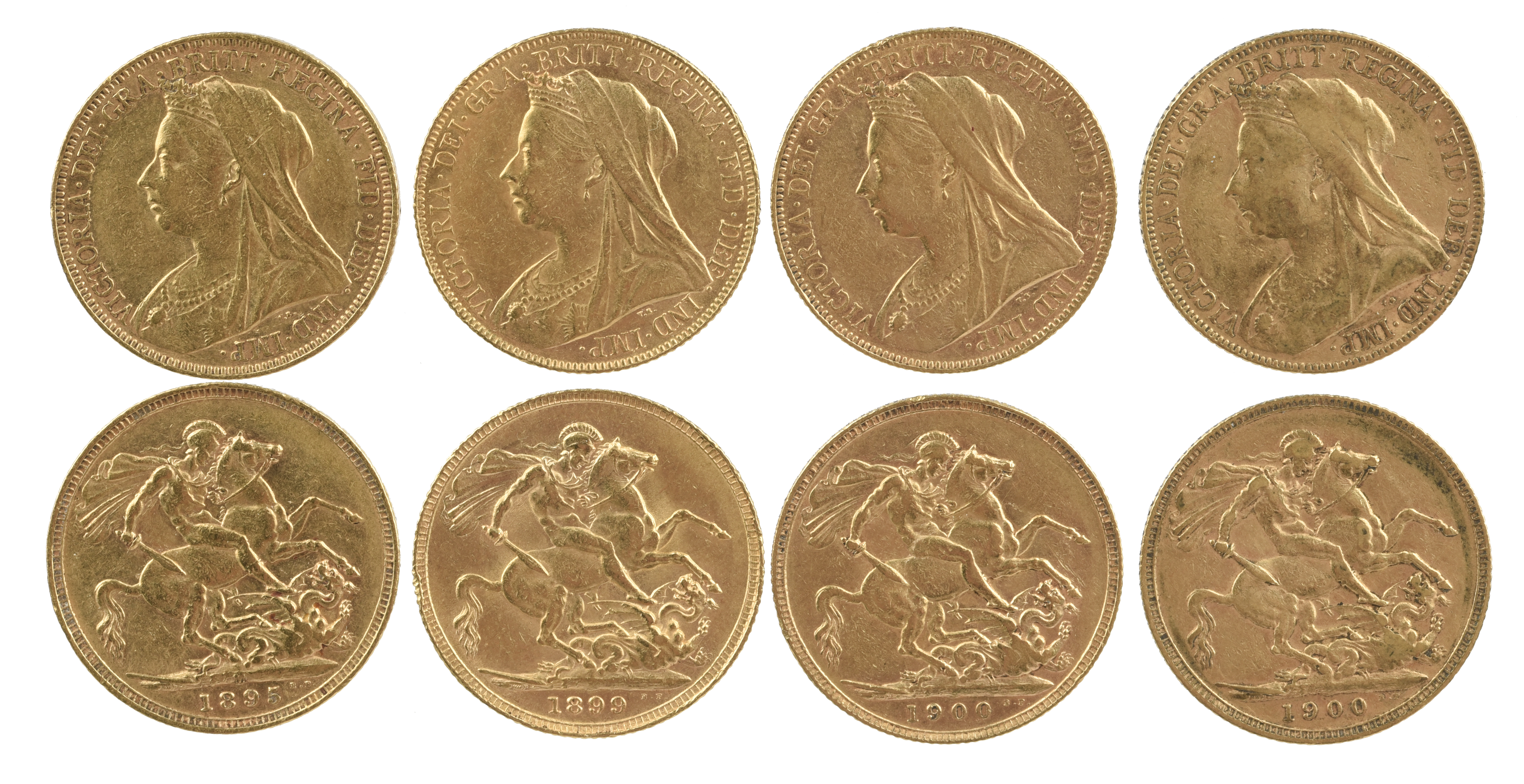 Victoria, gold sovereigns (4), veiled head: 1895, Melbourne Mint (S 3875); 1899, 1900 (2), London Mint (S 3874); good fine to near very fine. [4]