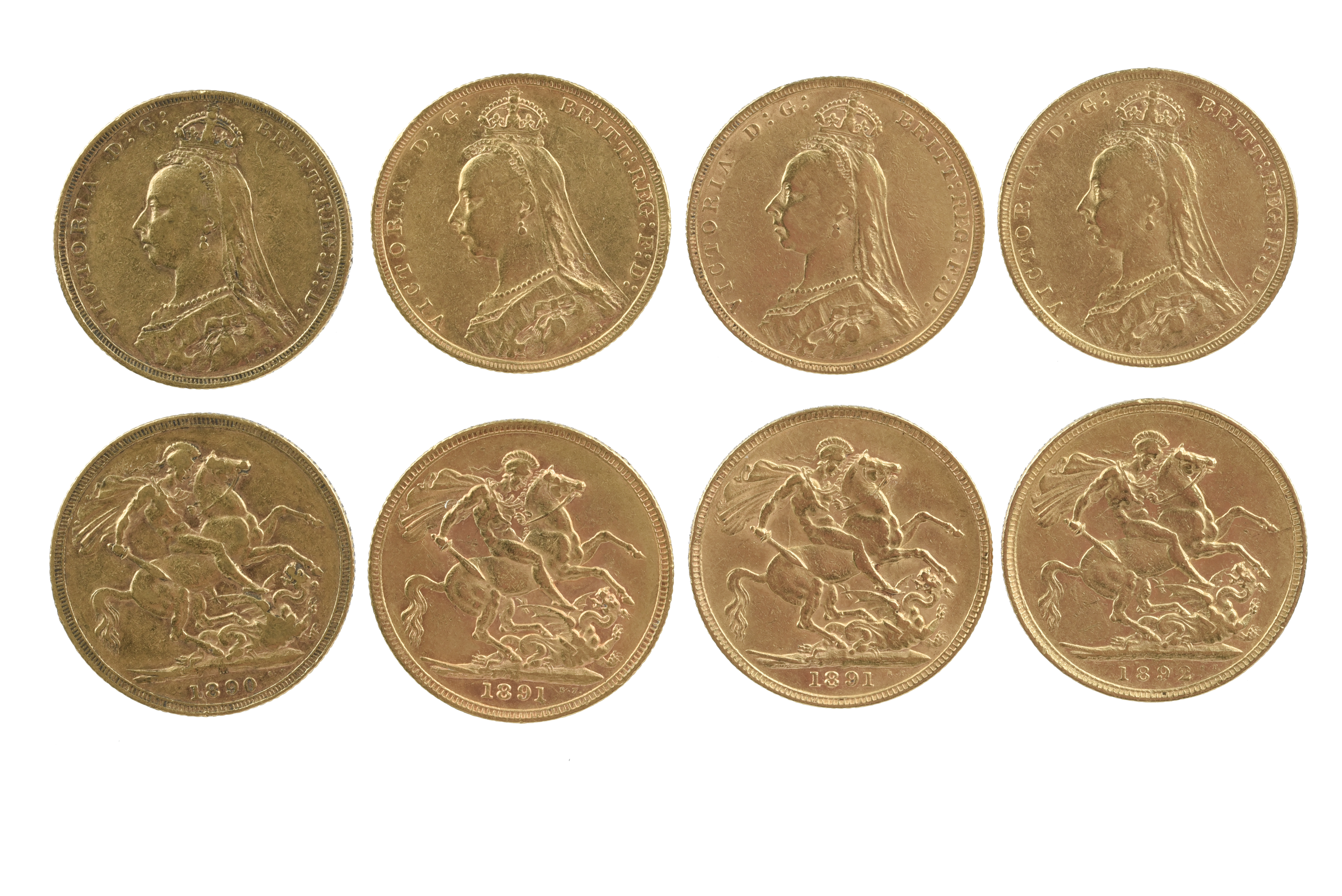 Victoria, gold sovereigns (4), Jubilee head: 1890, 1891, Melbourne Mint (S 3867B);1891, 1892, London Mint (S 3866C); good fine or better. [4]