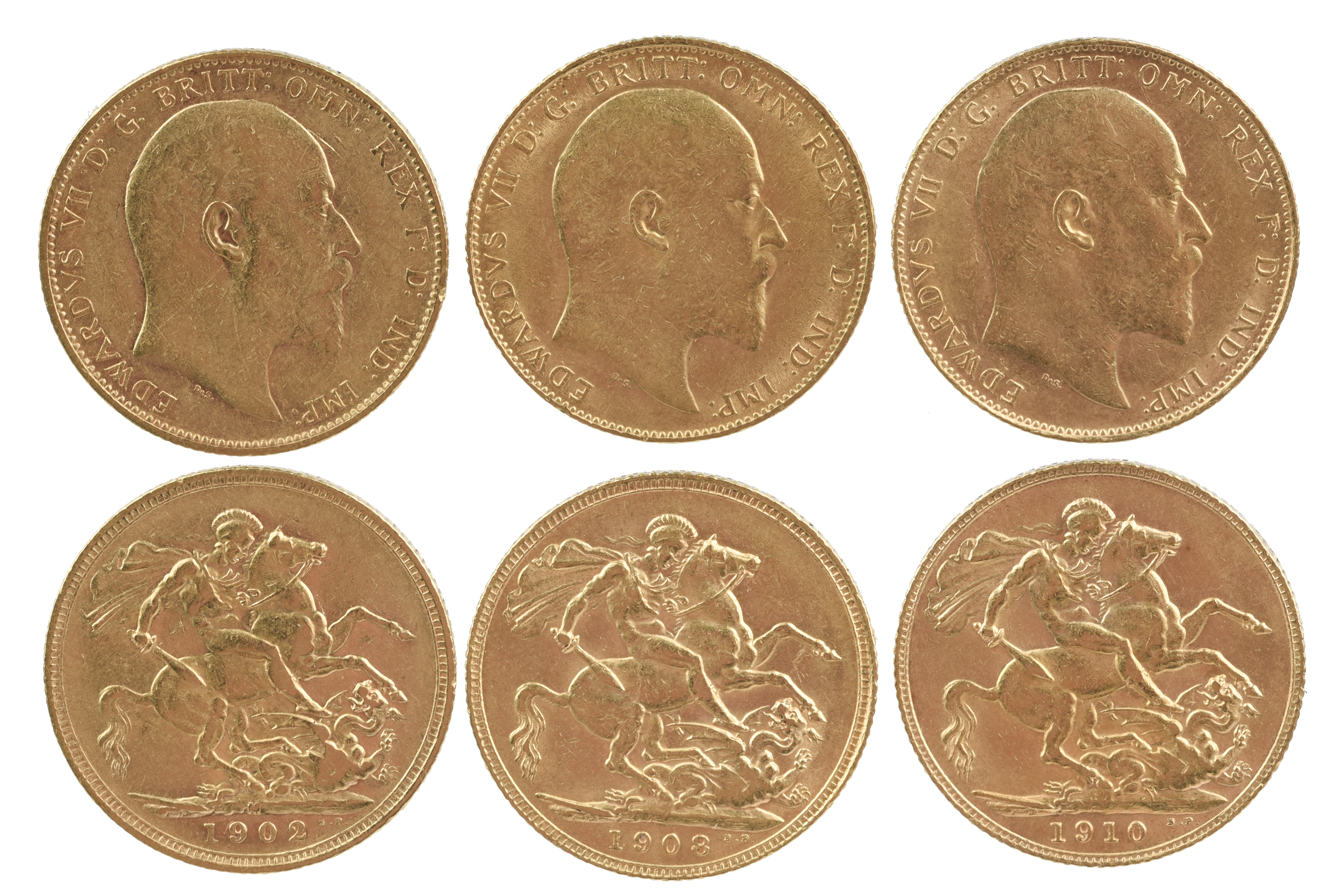 Edward VII, gold sovereigns (3): 1908, 1910 (S 3969); 1902, Melbourne Mint (S 3971); about very fine. [3]