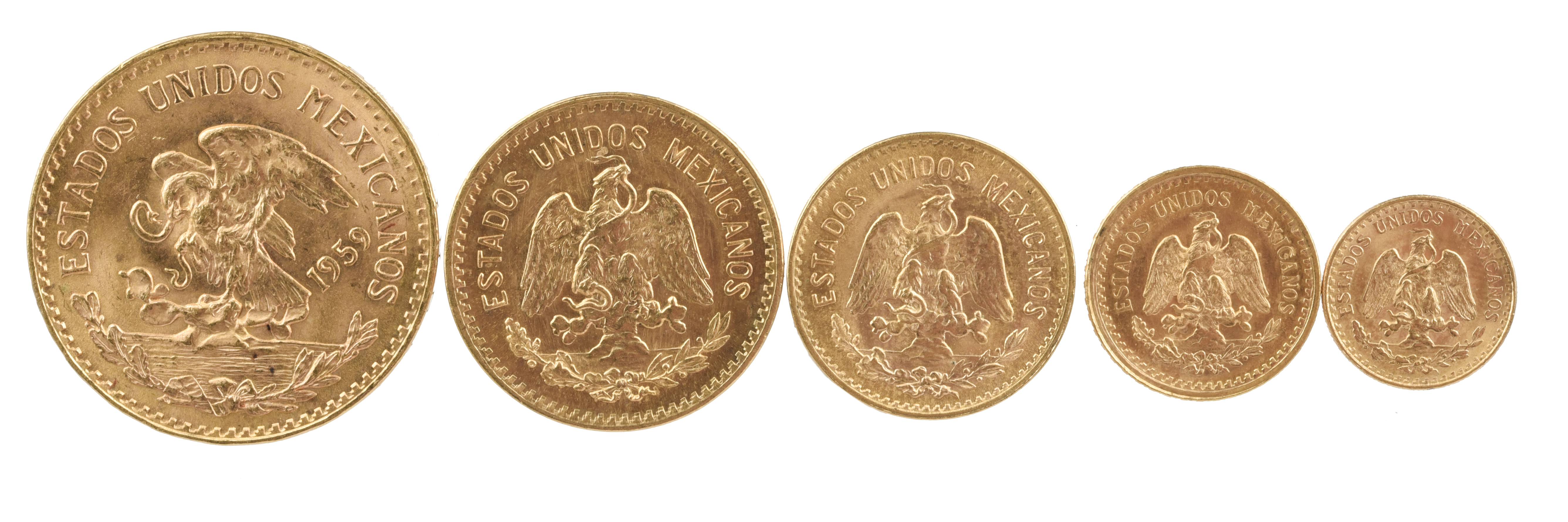 Mexico: a small group of gold coins, comprising: twenty pesos, 1959 restrike (F 171R); ten pesos, 1959 restrike (F 166R); five pesos, 1955 restrike (F 168R); two and a half pesos, 1945 restrike (F 169R); and two pesos, 1945 restrike (F 170R); nearly as struck. [5]