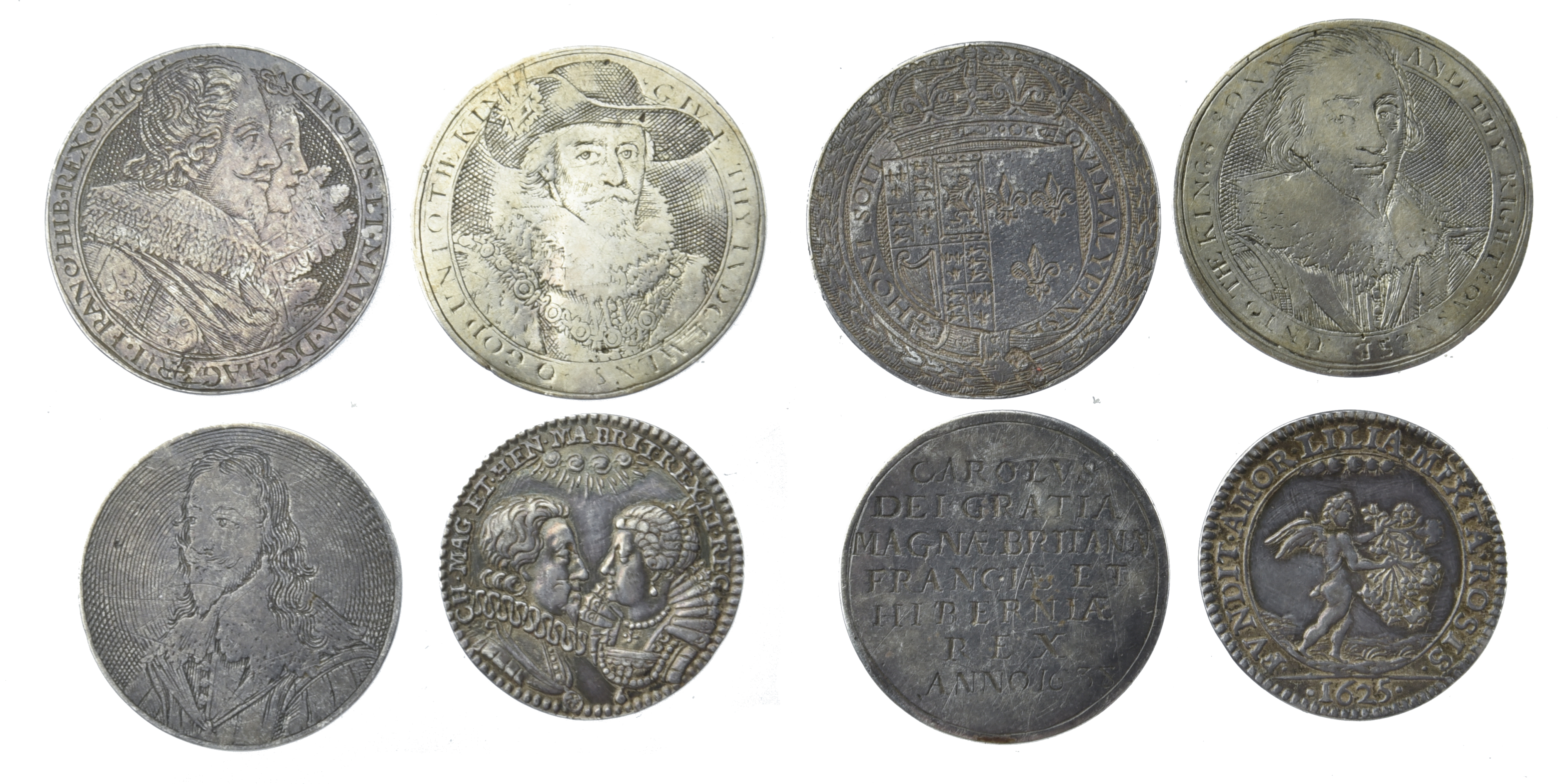 Charles I of England (1625-1649): two engraved silver tokens after Simon de Passe, the first with conjoined busts of the King and Queen Henrietta Maria, rev. Royal Arms, very fine; the second with quarter facing busts of the King and Prince Charles (later Charles II) to either face, slightly buckled, fine; another similar token, bust of Charles I quarter facing left, rev. his titles in six lines of text, fair; and a cast and chased silver medal, Marriage of Charles I to Henrietta Maria 1625, busts face to face, rev. Cupid scattering roses and lilies (E 105Ab), veryfine or alittle better. [4]