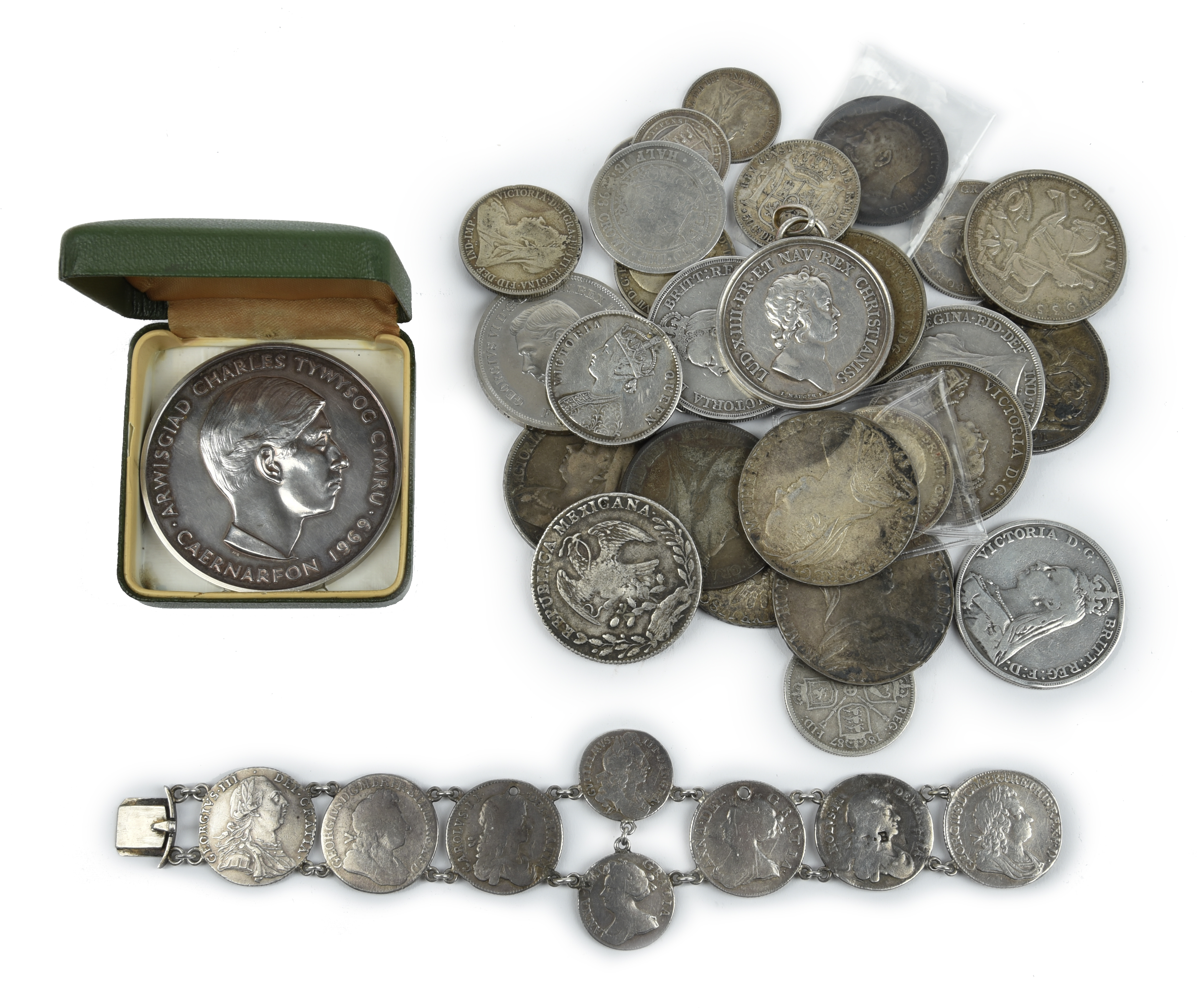 An international collection of silver and cupro-nickel crowns, crown equivalents and smaller denominations, including: Victoria, silver crowns (3), Jubilee head, 1887, 1889 and 1891 (S 3921), near very fine; florin, 1849, 'Godless' type (S 3890), near very fine; George V, half crown, 1911 (S 4011), extremely fine or nearly so; a bracelet formed from late Stuart and Hanoverian shillings (6) and sixpence (2) united by chain links; Mexico, 8 reales, 1856, with crude countermarks (KM 377.6), fine; and other coins and commemorative medals. [qty]