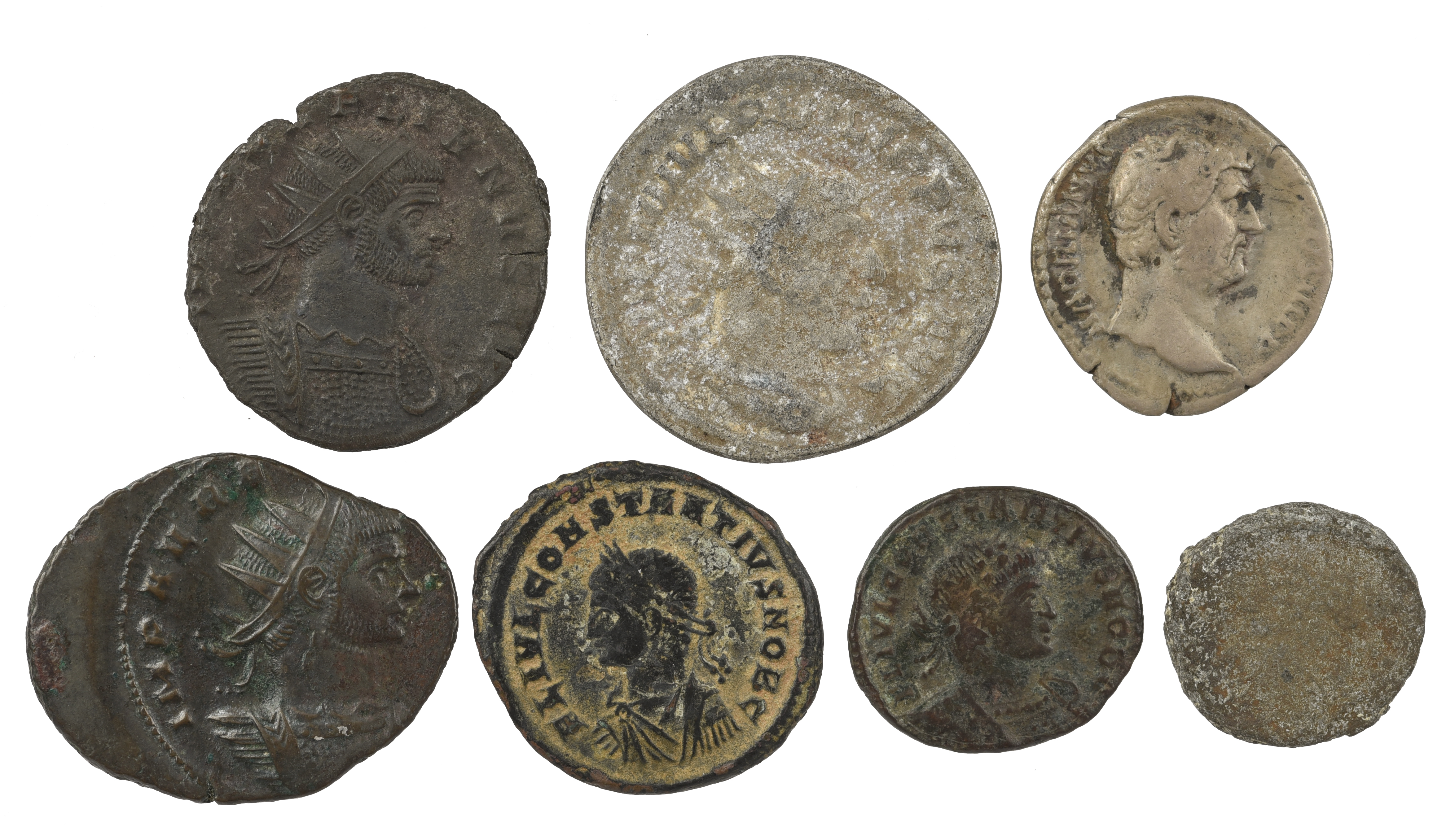 A small quantity of Roman coins, including: Hadrian (117-138), silver denarius, head right, rev. Monetas standing left with cornucopia and scales, 3.27g, near very fine; Aurelian (270-275), bronze radiate, armoured bust right, rev. Emperor greets a soldier holding Victory, VIRT MILITUM, 3.35g, fine; and other items. [7]