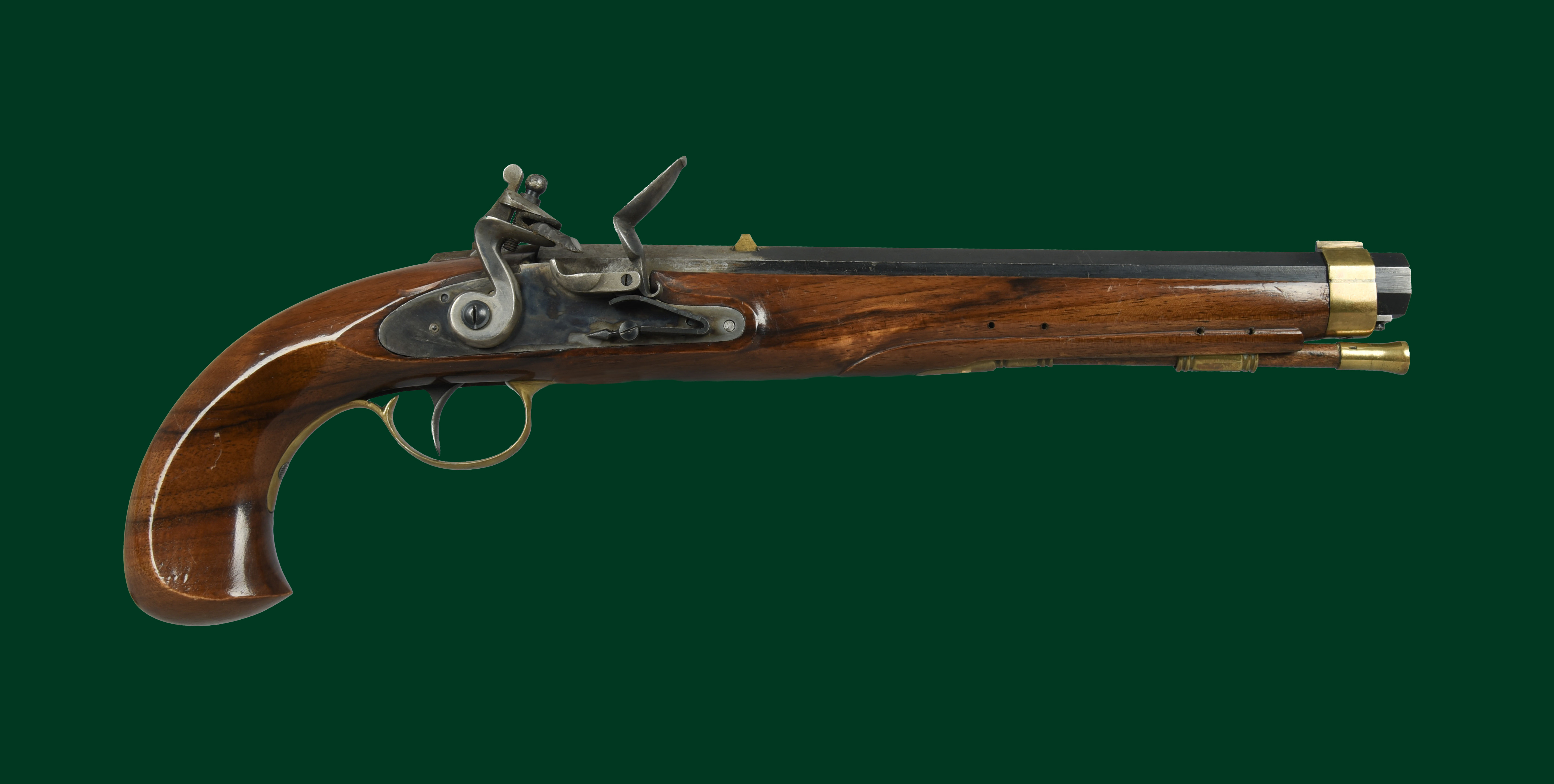 Ƒ An Italian replica flintlock pistol, .44, serial number 12212, rifled and sighted octagonal barrel 10 in., full stock with brass furniture, Italian black powder proof. Section 1 - FAC or RFD required to purchase.