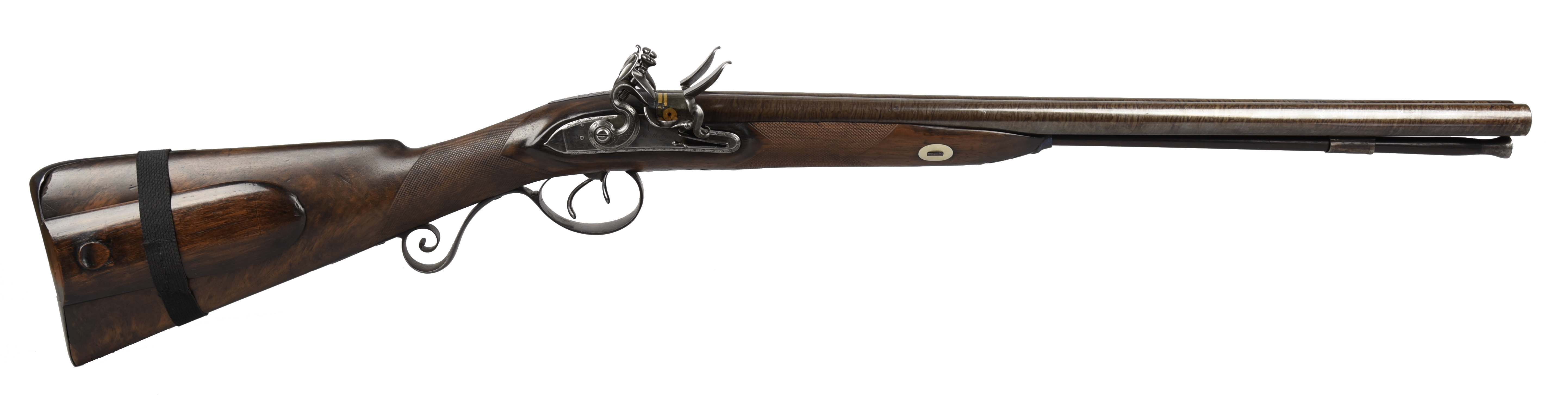 A scarce English flintlock double rifle of approximately .700 calibre by H.W. Mortimer, browned twist barrels 22.5 in., the left barrel inscribed 'H. W. MORTIMER LONDON' and the right 'GUN MAKER TO HIS MAJESTY', hollow top rib with low profile fore sight, gold lined pans and vents, London Company proof; lock plates with bell husk engraved borders and each inscribed 'H. W. Mortimer' and with personal crests of big-cat heads, engraved swan necked cocks, roller bearings in the heels of the frizzens; walnut half stock with steel furniture, scrolling trigger guard, patch box with sliding cover (restored), steel-tipped wooden ramrod; some refinishing including later chequering to the fore stock and wrist and re-blueing of the tang. Section 58(2) - no licence required if possessed as a curiosity or ornament.