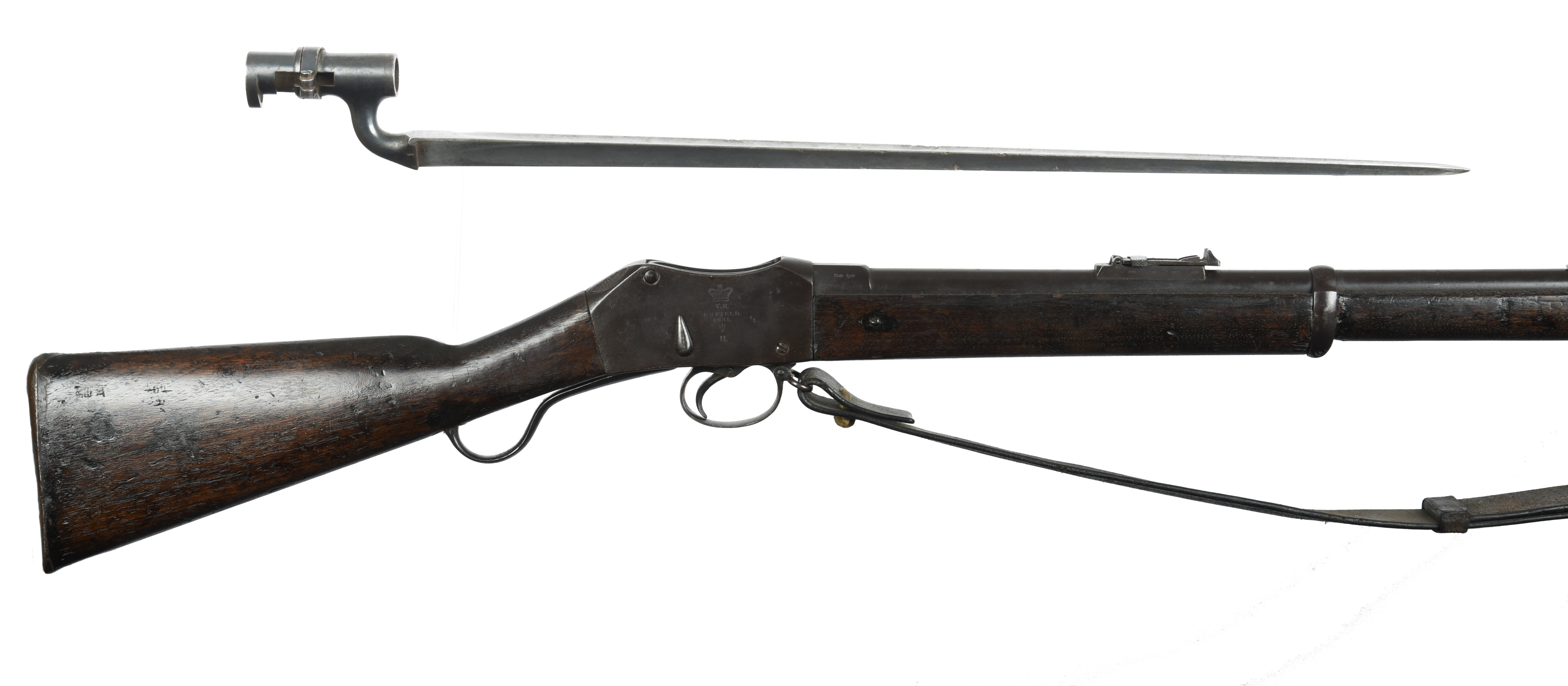 A .577/450 Martini Henry Mk II service rifle, Enfield 1885, barrel 33.25 in, or standard configuration and with a leather sling and a socket bayonet of the corresponding pattern and date. [2]. Section 58(2) - no licence required if possessed as a curiosity or ornament.