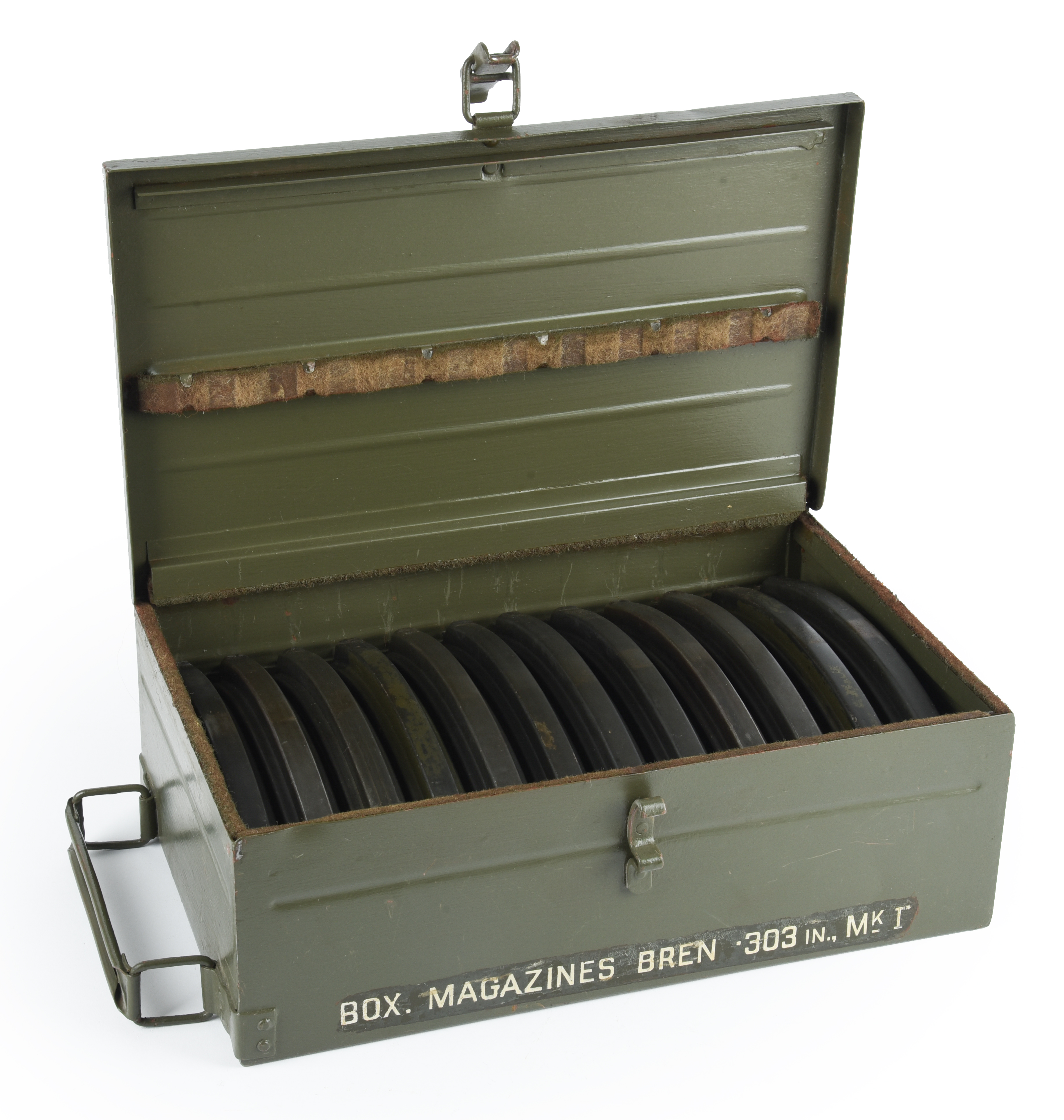 'BOX. MAGAZINES BREN .303 IN., MKI*', a steel transit case, complete with contents of twelve magazines for the BREN light machine gun.