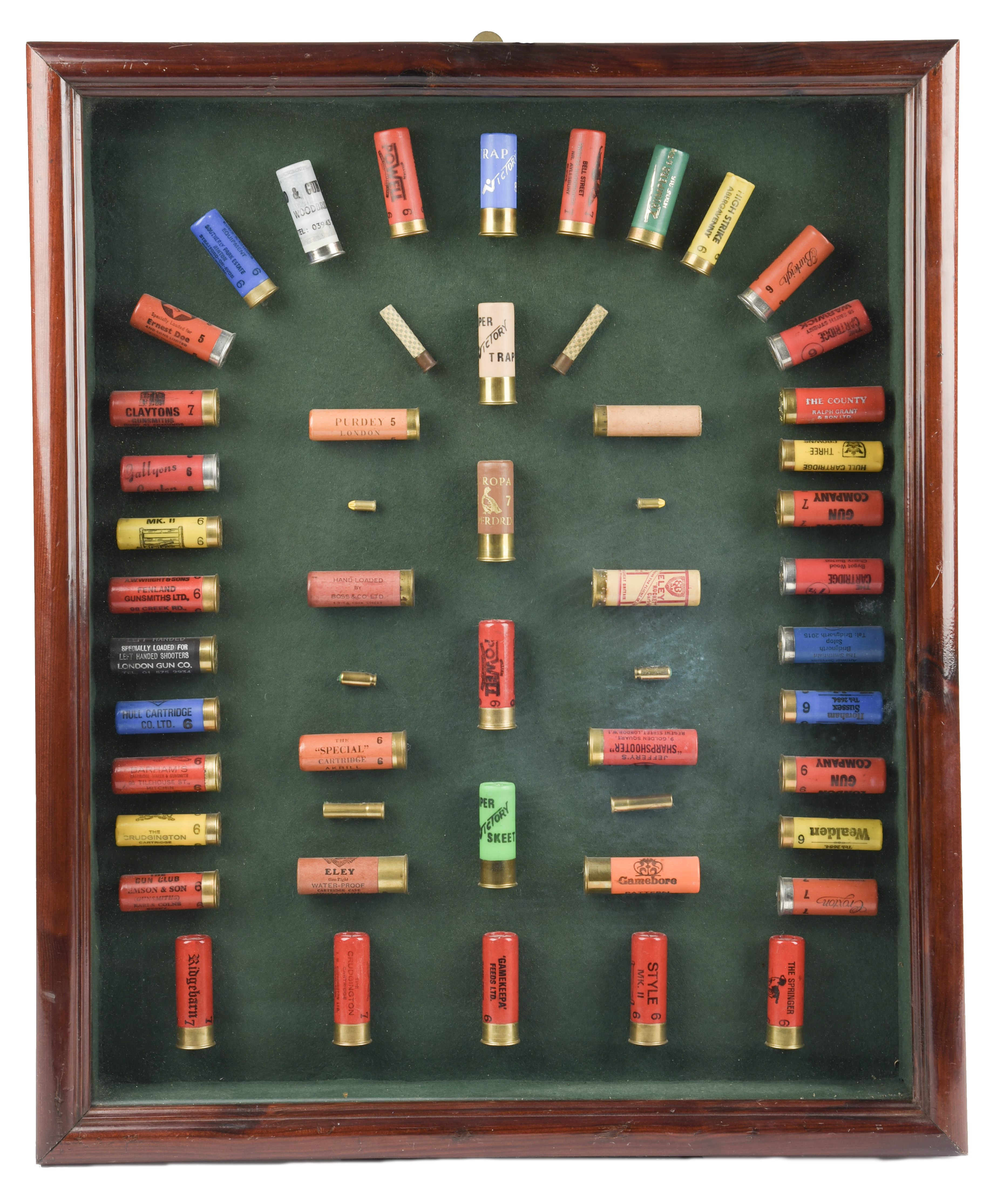 A glazed sporting cartridge display board, exhibiting a collection of 53 shot cartridges in the .22 rimfire to 12 bore range, various manufacturers and shot loads, mounted on a green felt backing. Shotgun certificate required to purchase.