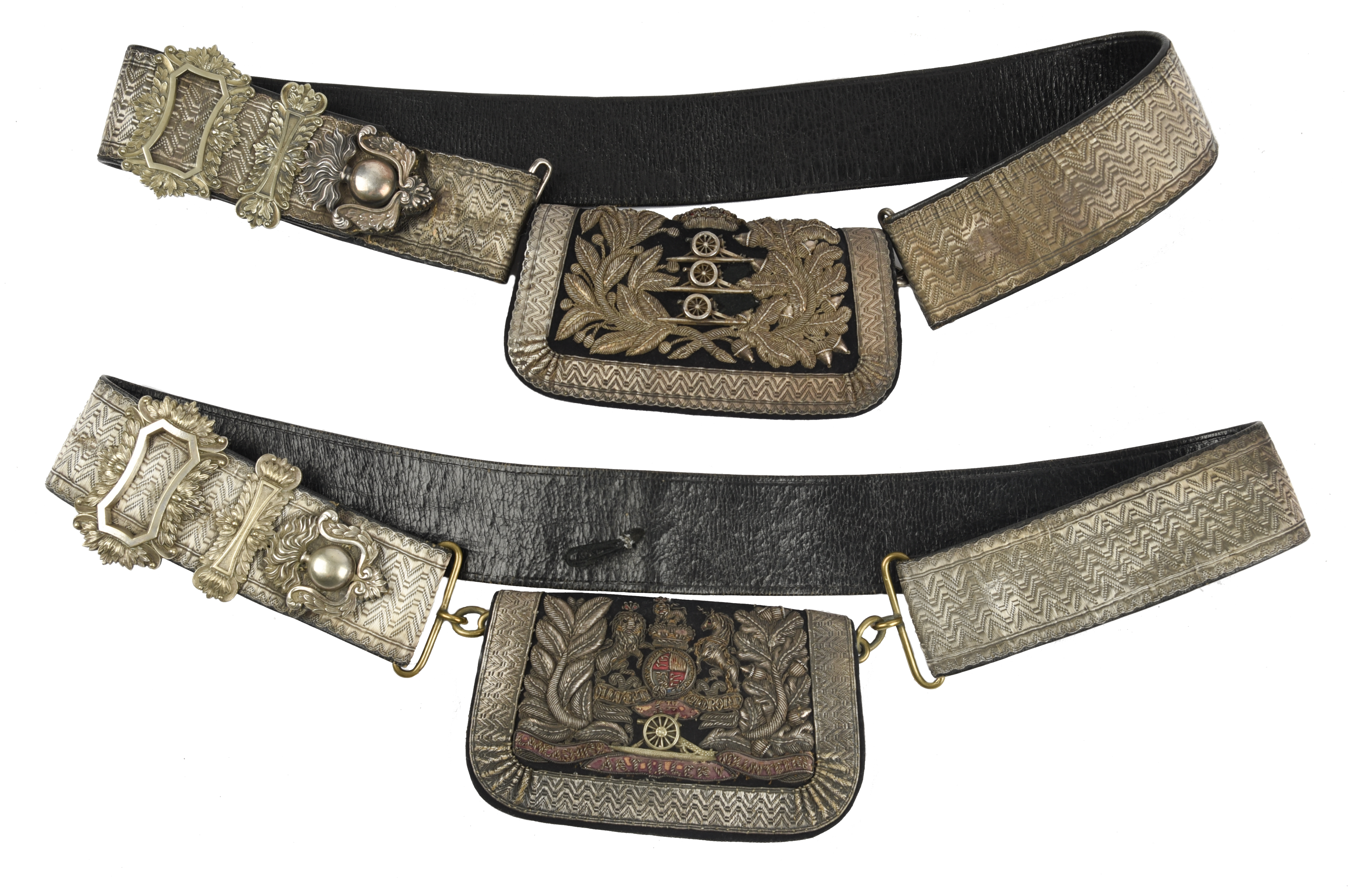 Two Victorian Artillery Volunteer officer's shoulder belts and pouches, with white metal fitting and faced with silver thread embroidery, the first with the Royal Arms and the title of the Lancashire Artillery Volunteers, the second with three applied field guns surmounted by a crown and supported by sprays of oak and laurel. [2]