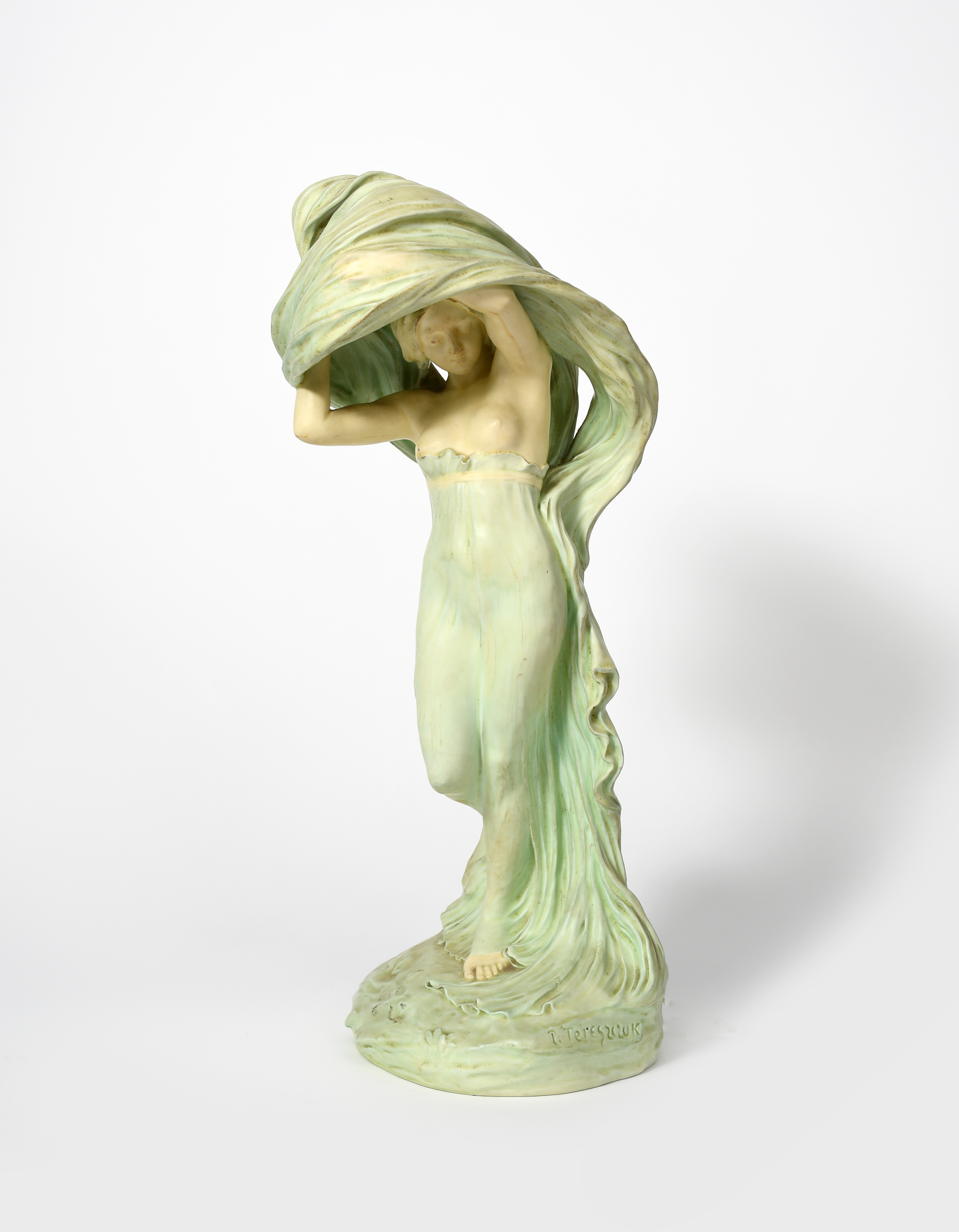 modelled as an Art Nouveau maiden, her billowing scarf held up to form the shade, glazed matt mint green and cream,