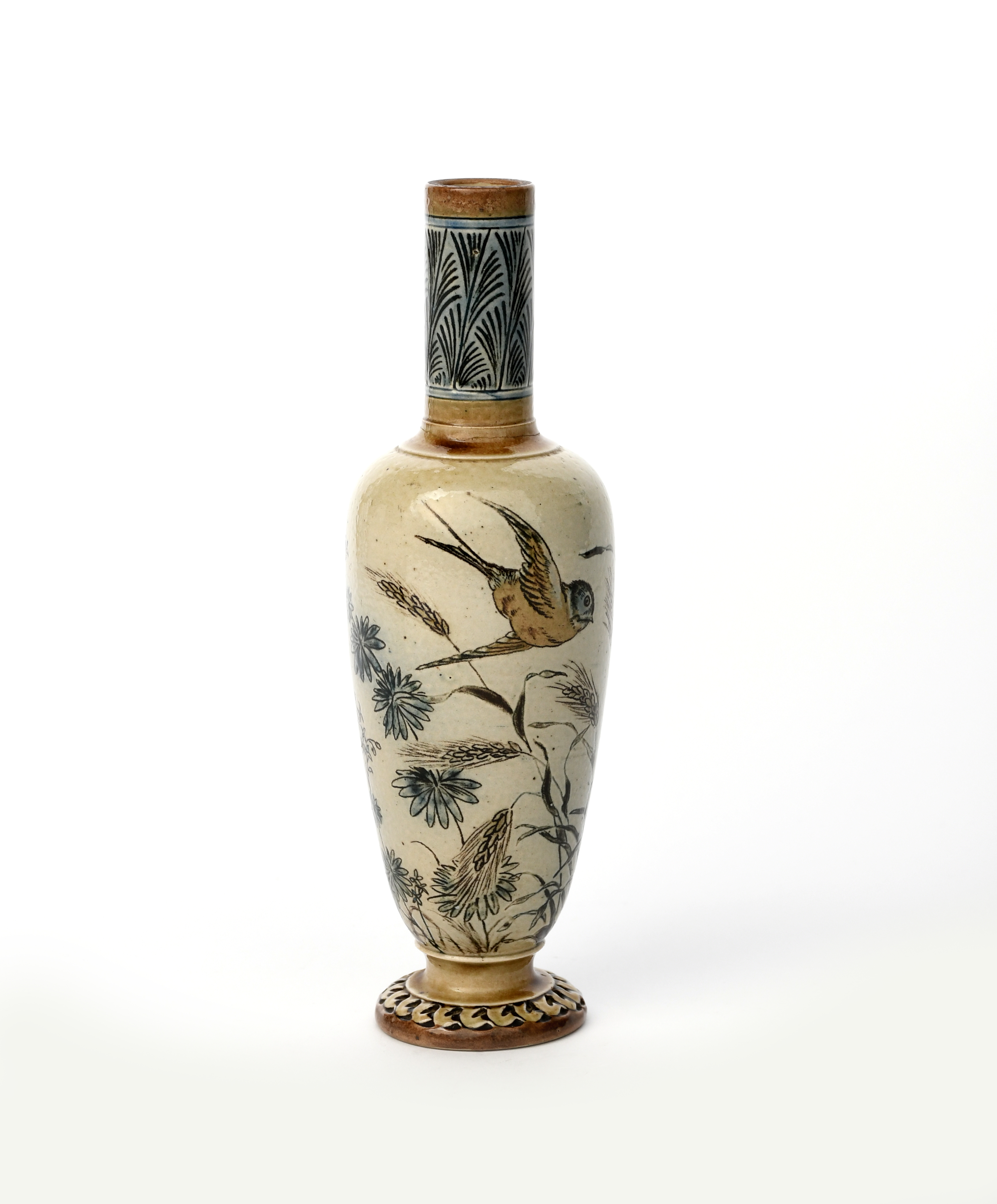A Martin Brothers stoneware vase by Robert Wallace Martin, dated 1884, slender bottle form with cylindrical neck, incised and painted with martins swooping over ears of corn, in blue and ochre highlighted in white on a buff ground, incised 12.5.84, R W Martin & Bros, London & Southall, neck restuck, 22.5cm. high