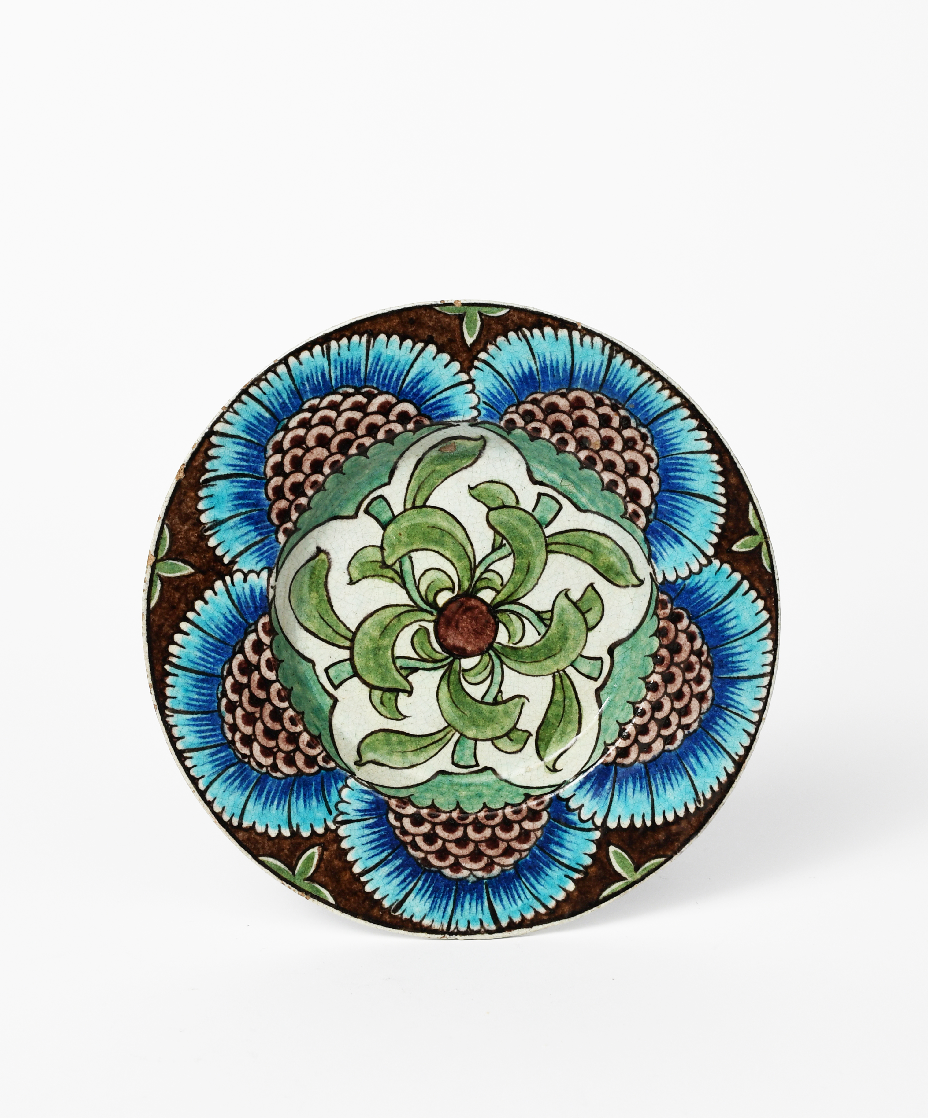 A William De Morgan pottery Persian plate, painted with a band of radiating carnation flowers in