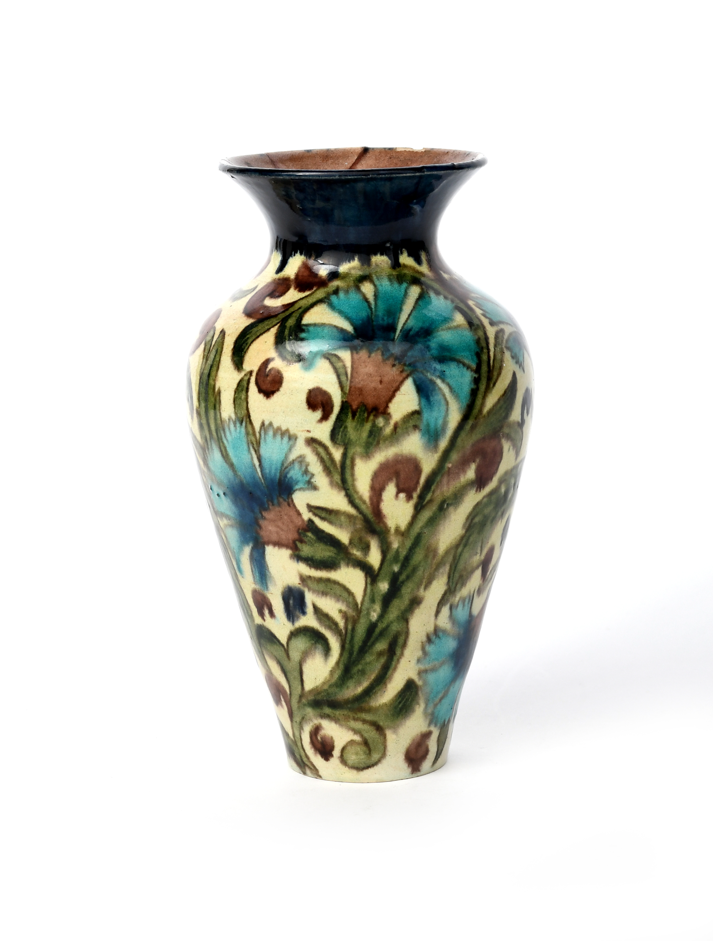 A William De Morgan Merton Abbey period Persian vase, painted by JB, shouldered form with flaring rim, painted with carnation flowers and scrolling foliage in blue, turquoise, green and aubergine on a cream ground, impressed factory marks, painted JB monogram, rim broken and museum restored, 23.5cm. high