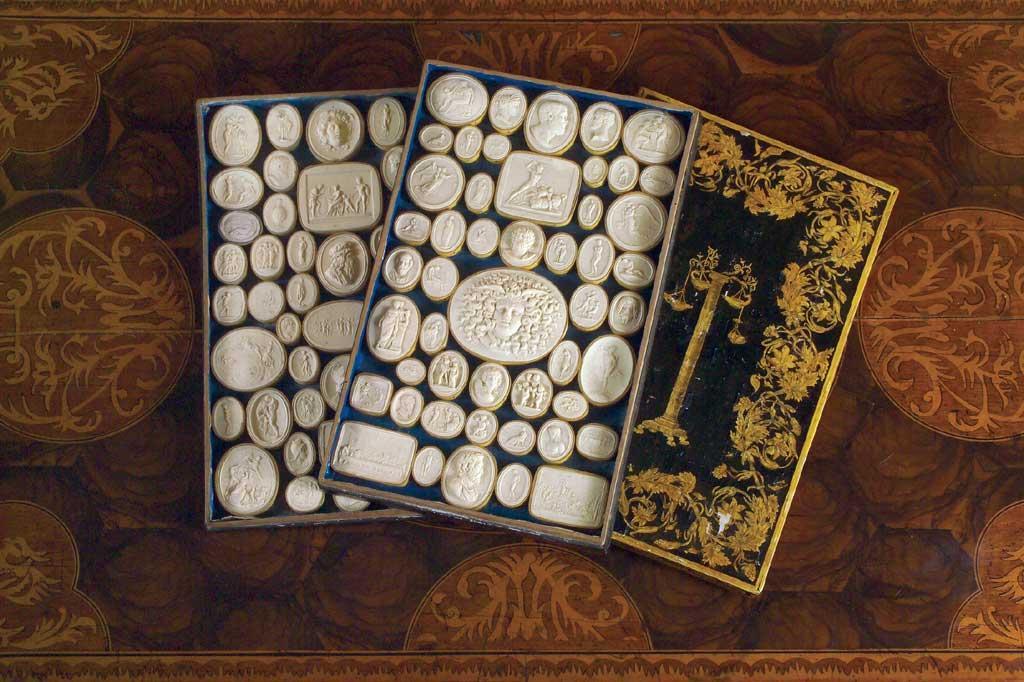 A set of 19th century plaster intaglio's, Biblical and Classical subjects, mounted on two trays, the penwork decorated cover centred a column hung with four oil lamps. (98)