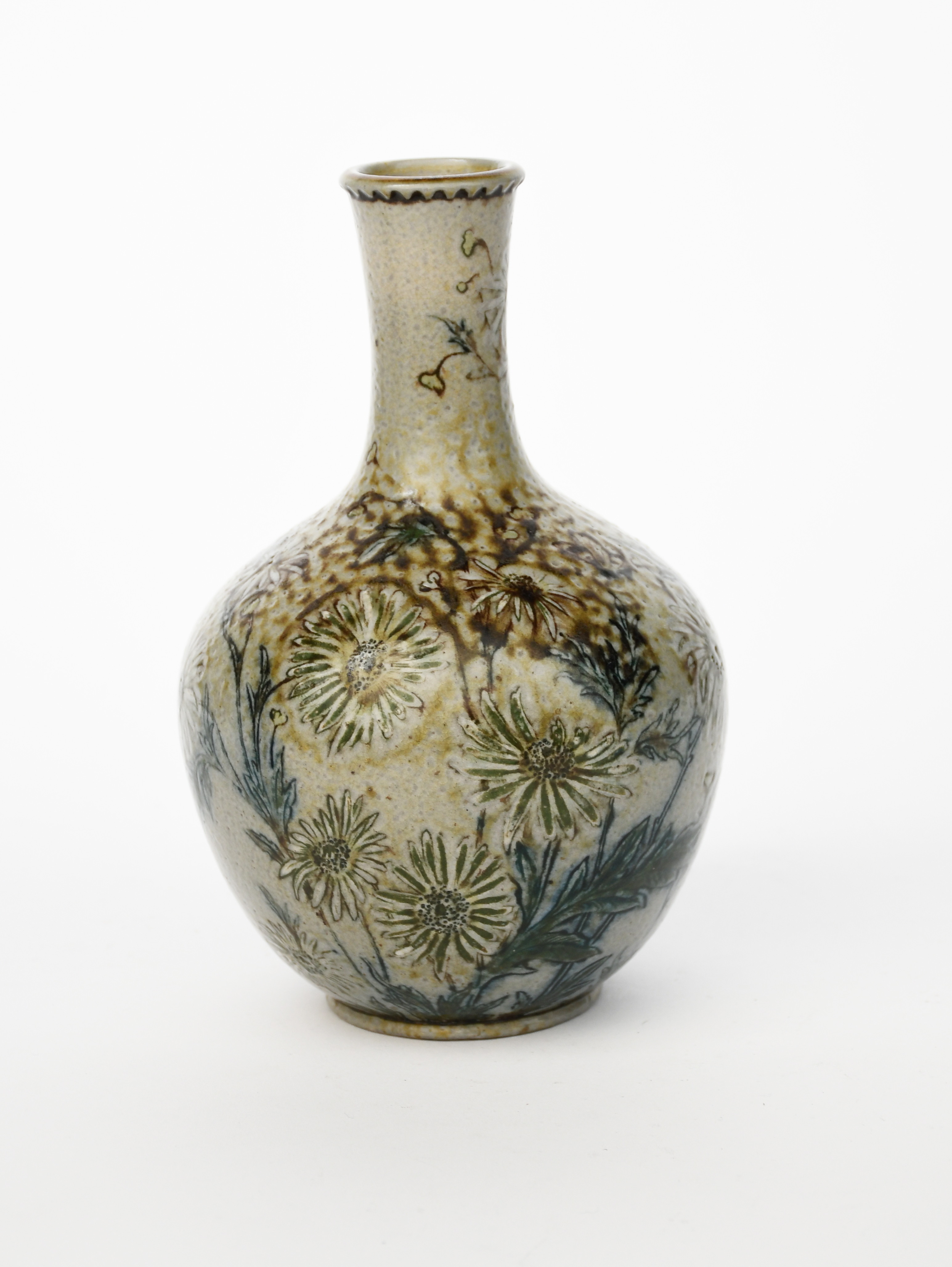 A Martin Brothers stoneware vase, dated 1889, ovoid with cylindrical neck, painted with daisy flowers in ochre, green and white on a mottled ground, incised 1889 Martin Brothers, London & Southall, 20.5cm. high
