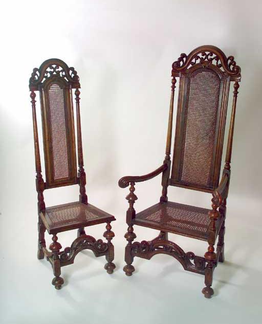 A set of six carved and turned stained beechwood chairs, the leafage scroll pierced arched crests above caned panels flanked by turned supports, the tapering caned seats with later cushions, the mushroom turned and block legs with a conforming arched front stretcher and an H stretcher, comprising a pair of open armchairs and four side chairs. (6)