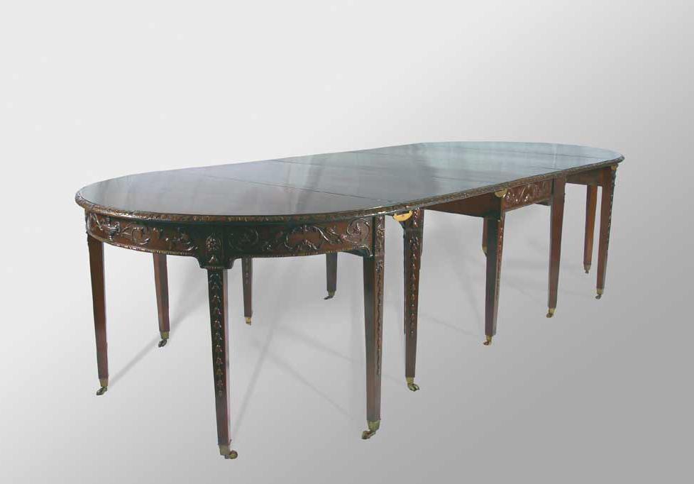A mahogany dining table, comprising a central drop leaf table and a pair of d-ends, the leaf carved edge above an arcaded frieze with applied urns and scrolling husks with a baton and bead moulding, on paterae headed square tapering legs with conforming husk decoration and brass castors, with paper labels to the framing 'Property of the Trust of the Late Douglas Stewart Sandeman. Care of Messrs Sheild & Kyd.' 18th century and later. 71cm (28in) high, 287cm (113in) long, extended, 122cm (48in) wide.