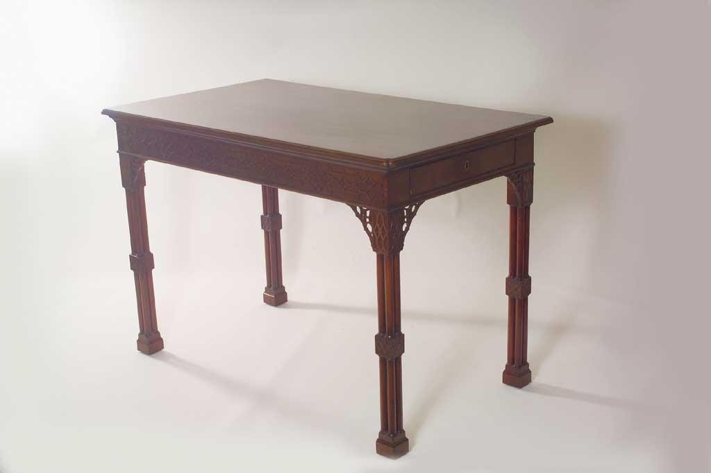 A mahogany serving table, the moulded edge top with cusp front corners, above a blind fret frieze, having plain end drawers on blind fret block and quadruple column supports with pierced brackets, with brass roller castors, 19th century and adapted, 87cm (34.25in) high, 129cm (50.75in) wide, 74cm (29.25in) deep.