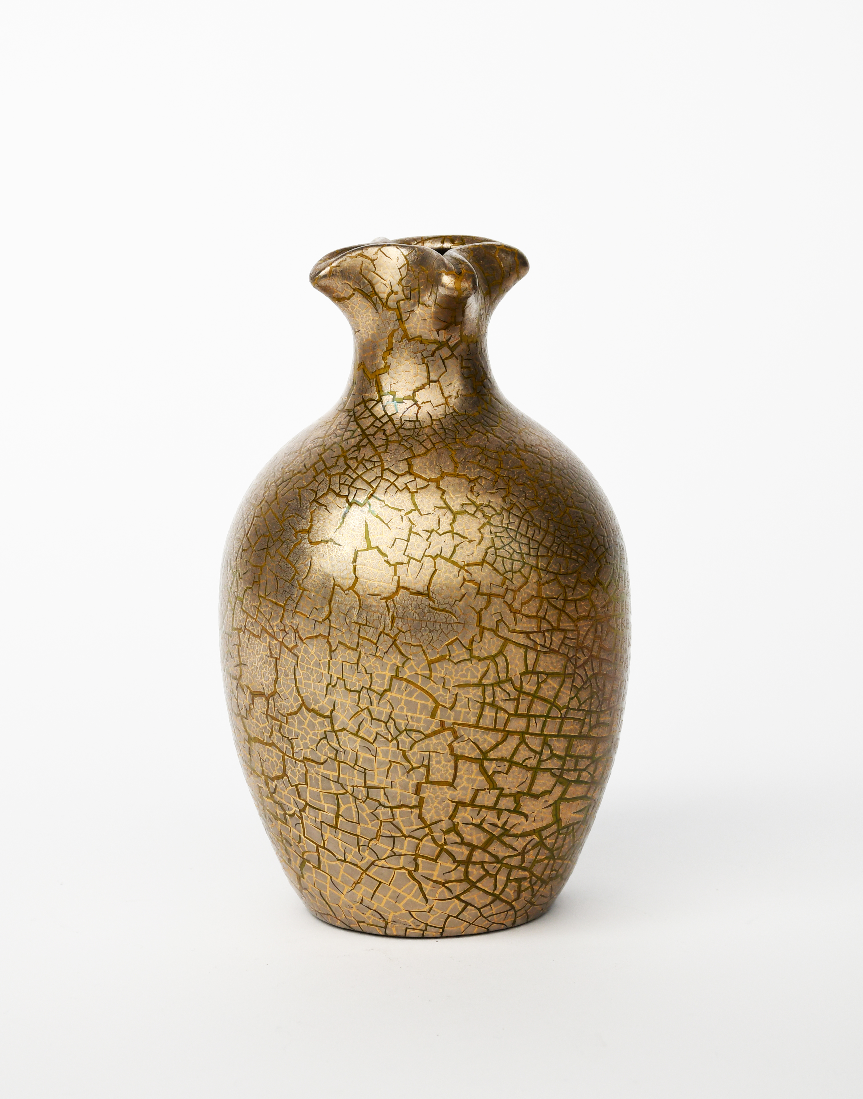 A Sunflower Pottery vase by Sir Edmund Elton, shouldered ovoid form with pinched neck, covered in a crackled gold glaze over lime green, painted Elton mark, 19cm. high