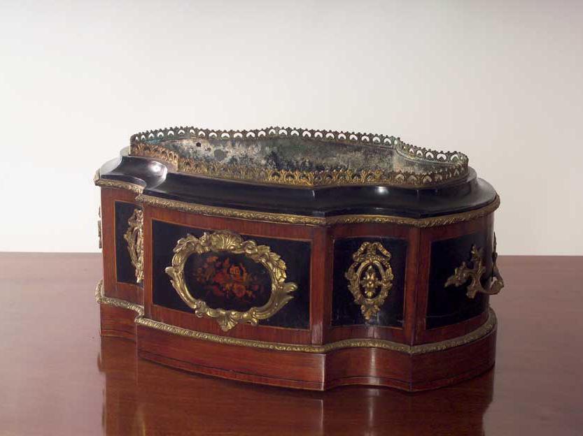 A late 19th century French kingwood, ebonised and floral marquetry inlaid jardiniere, of shaped outline with concave corners, having gilt brass mounts and a zinc liner, 23cm (9in) igh, 47cm (18.5in) wide, 34cm (13.5in) deep.