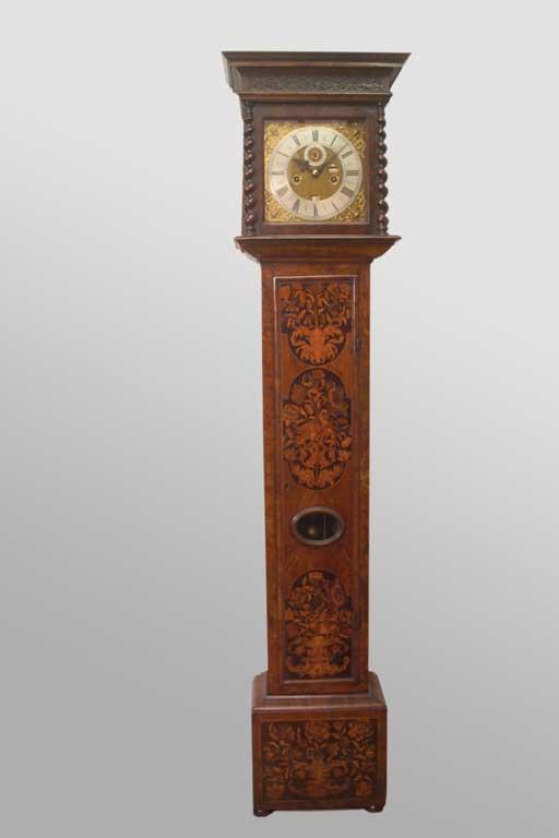 A late 17th century walnut and marquetry inlaid longcase clock, the 8 day five pillar movement striking on a bell, the 10in. square brass dial with subsidiary seconds and zodiac symbol apertures, with engraved borders on a matt ground, steel hands, with cast gilt brass cherubs head spandrels and foliage engraving, inscribed 'Edmund Appley Charing Crofs' with a fabric backed pierced frieze above spiral pilasters, with ebonised ground marquetry of birds and foliage, the trunk door with oval lenticle, on flattened bun feet, 193cm (76in) high. Edmund Appley is recorded as working in London c.1677-1693.