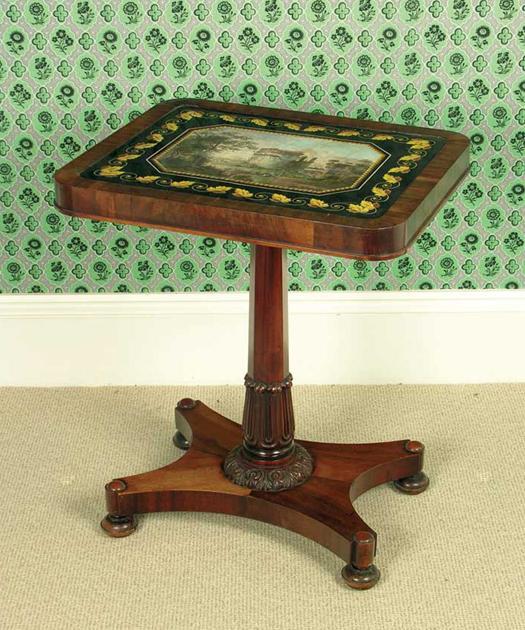 A George IV goncalo alves and scagliola inset occasional table, decorated with the tomb of Cecilia Matella, repaired, with a leaf border on a faceted and leaf carved stem the quatreform base with turned feet, the underside with a printed label 'Peter Della Valle & Brothers, Manufactures & Painters of Scagliola, Num 1473, Per Porta Cappuccini Leghorn,' 68cm (26.75in) high, 58cm (22.75in) wide, 47.5cm (18.75in) deep. The Peter Della Valle brothers were accomplished Italian artists in scagliola in the mid nineteenth century with workshops at Leopolda Street, Palazza Maria, Livorno (or Leghorn as it was known in English) on the Ligurian coast. One of the most important examples of their production is a scagliola slab which forms the top made for a table exhibited by the brothers at The Crystal Palace Exhibition in 1851. Interestingly, the equally accomplished base was made by two other brothers, Luigi and Angiolo Falcini (1794-1861 and 1801- 1850 respectively) who had their workshops in Florence and were known for their excellence in floral marquetry compositions in the style of the seventeenth century marqueter Leonardo van der Vinne. This table originally on loan to The Los Angeles Museum forms part of The Gilbert Collection now in London. Literature: Anna Maria Massinelli, The Gilbert Collection, Hardstones pub. Philip Wilson, 2000 exh. 33 p.103. Alva Gonzlez-Palacios, The Art of Mosaics, revised edition,1982, no.81, p. 180. Another known composition of The Della Valle brother's work is the scagliola table slab after the Bolognese baroque era painter Guido Reni (1575 - 1642) depicting the goddess of the dawn opening the gates of heaven to Helios riding in his chariot. The inspiration for this composition was a fresco that they copied from the ceiling of the Casino Rospiglioi in Rome. See examples offered at Phillips London, 12.02.85 and Christies, London, 10.03.88, lot 41. Their workshops also produced circular scagliola slabs for centre tables notably an example that featured the seven views of Rome, the scagliola used in conjunction with 'encausto' (a surface decoration similar to the fresco technique). See examples offered at Sotheby's London. 11.12.92. Lot 381 and Christies New York 25.10.91, lot 144. The classical blue scrollwork border decoration on the former comparable in feel to the present example being offered for sale. Scholars have over the years erroneously referred to scagliola as a cheaper alternative to pietre dure. Scagliola was produced down to a price as was pietre dure, however the finest work by the eighteenth century had exceeded that of pietre dure in the extraordinary artistic compositions achieved by the scagliolarists. These artists mixed together a variety of earth colours as one would use a palette of paint enabling them to create subtle tones in their work as never seen before. Scagliola, a composite material, akin to plaster, is made from selenite, the purist form of gypsum. This is calcined, reduced to a