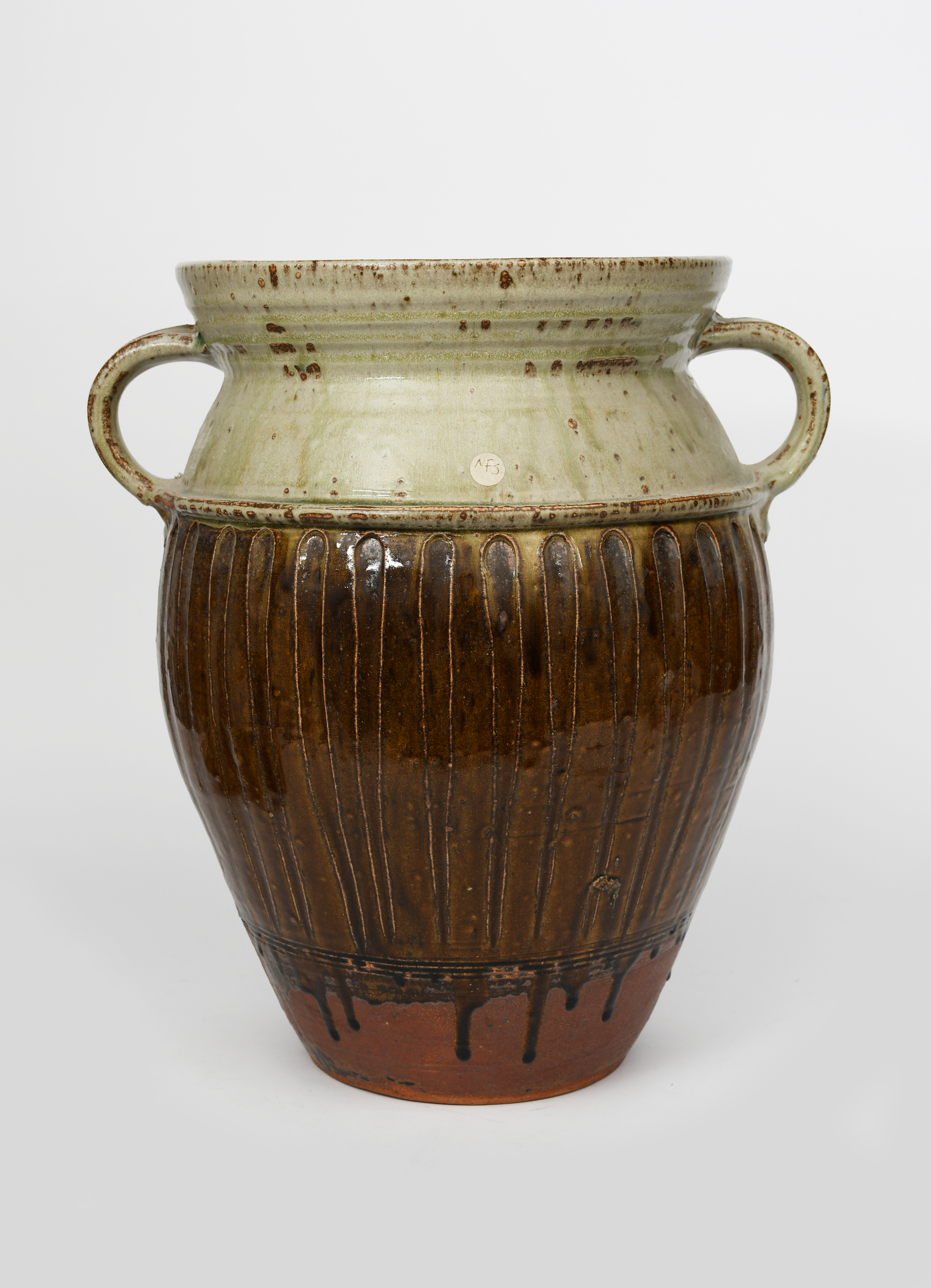 a large stoneware garden pot made at the Durweston Pottery, shouldered, twin-handled form, covered with an ash glaze above black iron, with three drainage holes to the base,