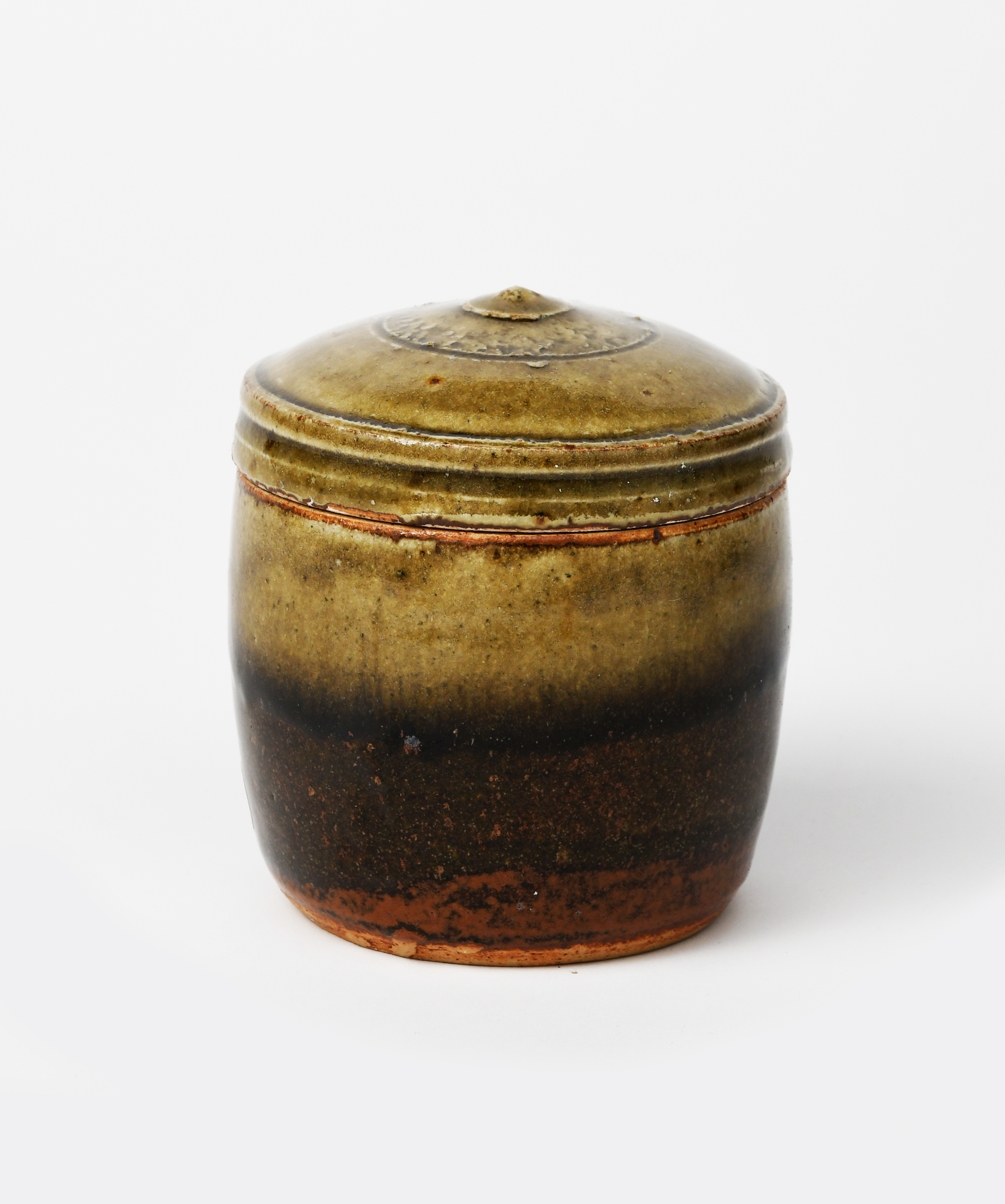 a stoneware small caddy and cover, covered in black and iron and ash glaze, the cover with circular motif,