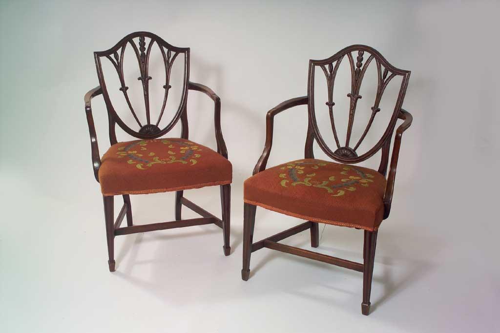 A pair of George III mahogany shield back open armchairs, with carved foliage, husks and paterae, the moulded scroll arms and serpentine front seats with later needlework dated 1955, on moulded square tapering legs united by an H stretcher and spade feet, one chair with replaced arms. (2)
