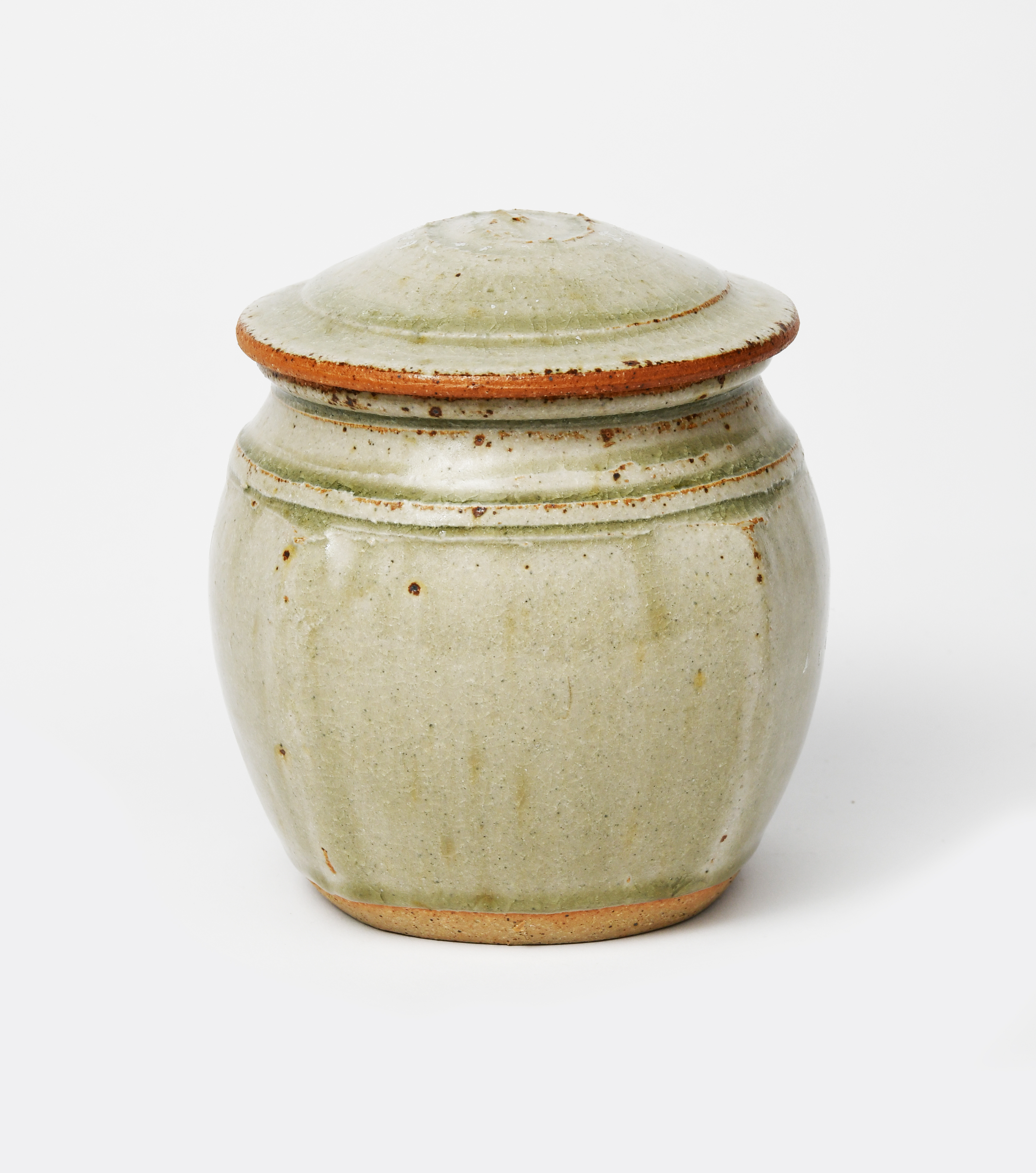 a stoneware little beaten jar and cover, covered in an ash glaze,