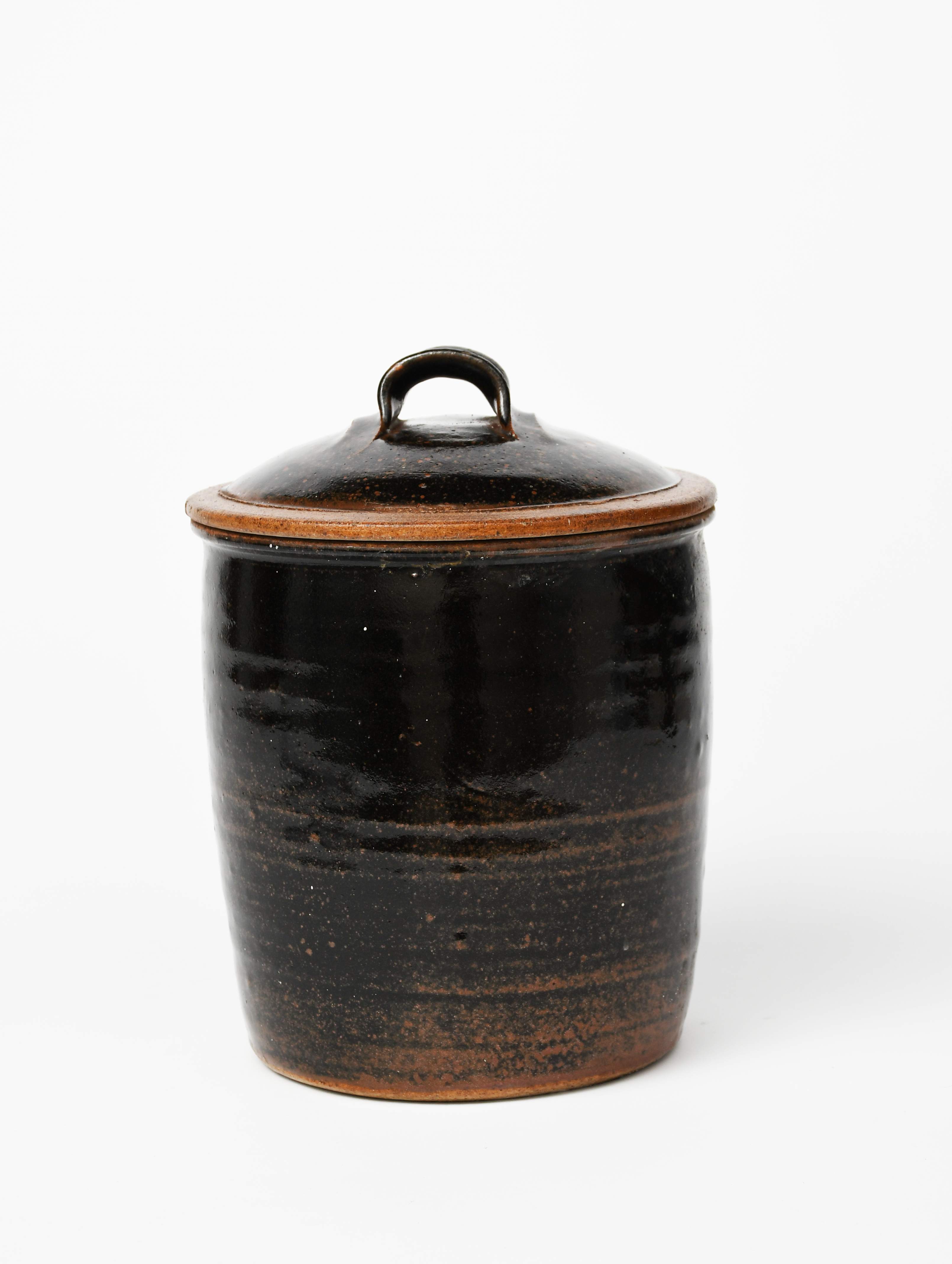 a stoneware jar and cover, covered in a dark river iron glaze