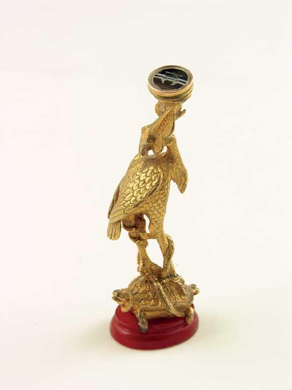 A 19th century gilt brass seal, modelled as a tortoise, supporting a crane with an entwined snake and holding a fish, with a carved agate matrix, 9.5cm (3.75in) high.