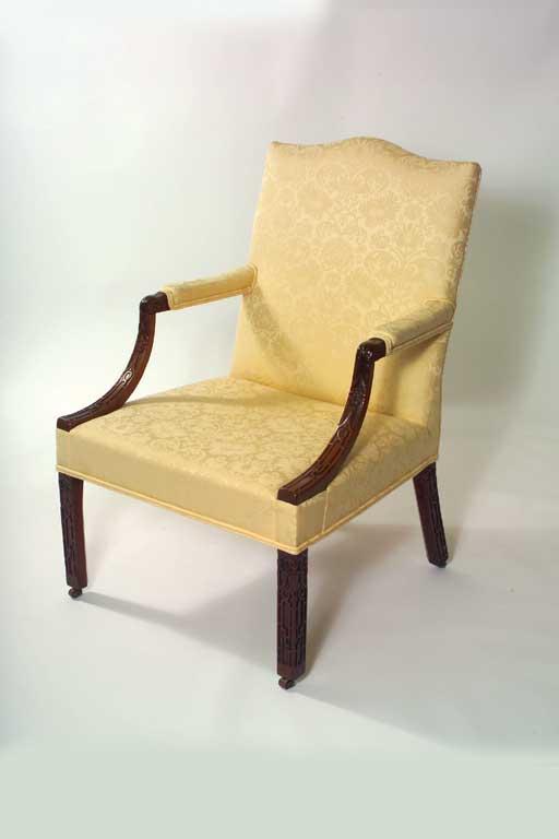 A George III mahogany Gainsborough armchair, upholstered in a cream patterned material, with carved and blind fret scroll arms supports, the conforming square chamfered legs with leather roller castors.