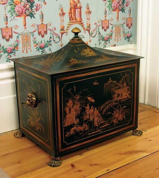 A black and gilt japanned rectangular tole coal box decorated with oriental scenes and foliage...