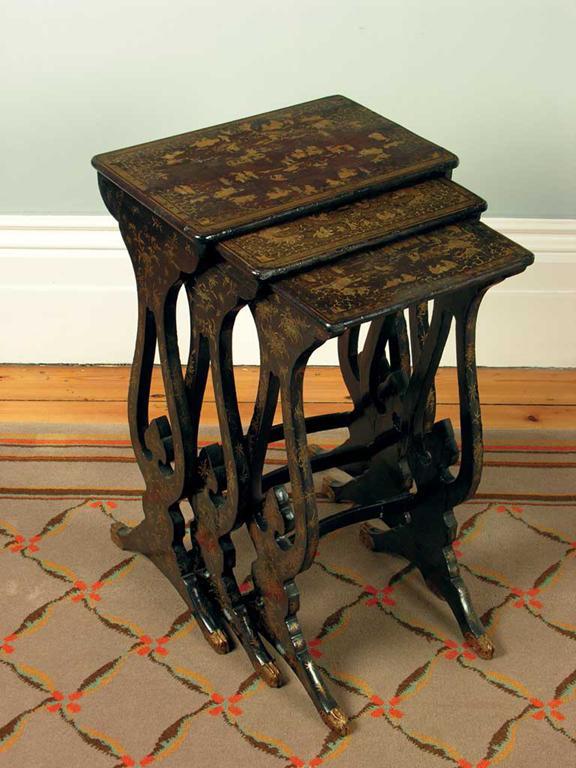 A nest of three late 19th century Chinese lacquer tables, with gilt decoration of figures in garden landscapes, 69-65cm (27-25.5in) high, 43-33cm (17-13in) wide, 29-25.5cm (11.5-10in) deep. (3)