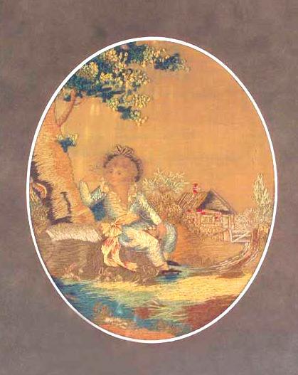 A matched pair of 19th century oval silk and woolwork panels depicting a shepherdess and a young boy