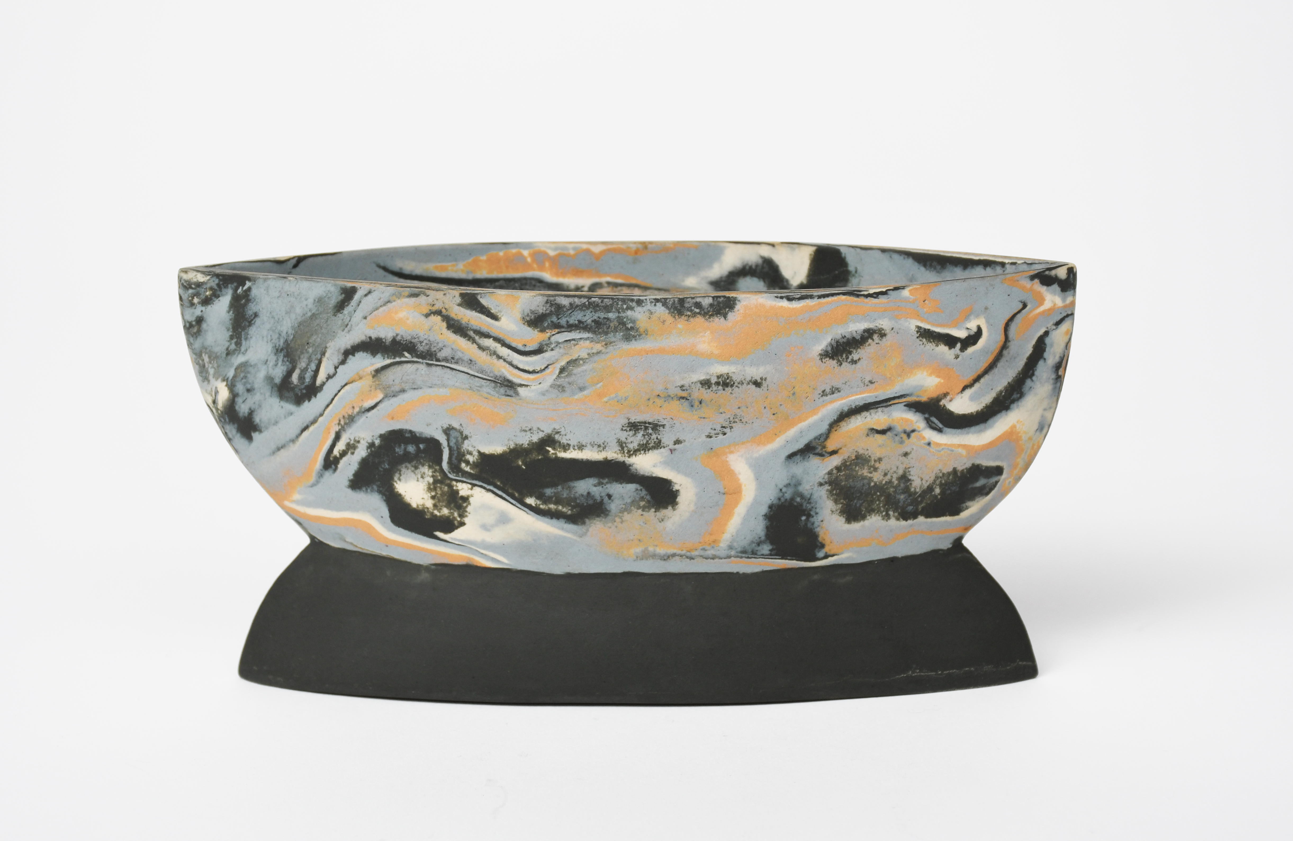 a footed vase, elliptical section, marble blue, tan, black and white glaze on black foot,