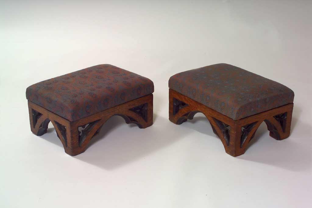 A pair of George IV Gothic oak footstools, the later stuffed over tops on pierced trefoil and carved arch bases, 19.5cm (7.75in) high, 38cm (15in) wide, 28cm (11in) deep. (2)