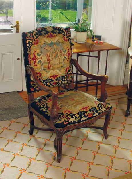 A carved and stained wood Louis XV style fauteuil, having a needlework covered back and seat, with scroll arms and supports, the serpentine front seat with foliage and shell apron on cabriole legs united by a shaped X stretcher.