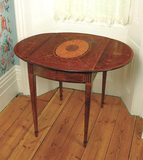 A George III marquetry inlaid pembroke table, the oval twin flap top with a rosewood ground and centred with a paterae with garlands, husks, urns issuing scrolling leafage and bell flowers, above a satinwood and rosewood crossbanded drawer on faux fluted and satinwood headed square tapering legs and spade feet, 70.5cm (27.75in) high, 93cm (36.5in) open, 71cm (28in) deep.