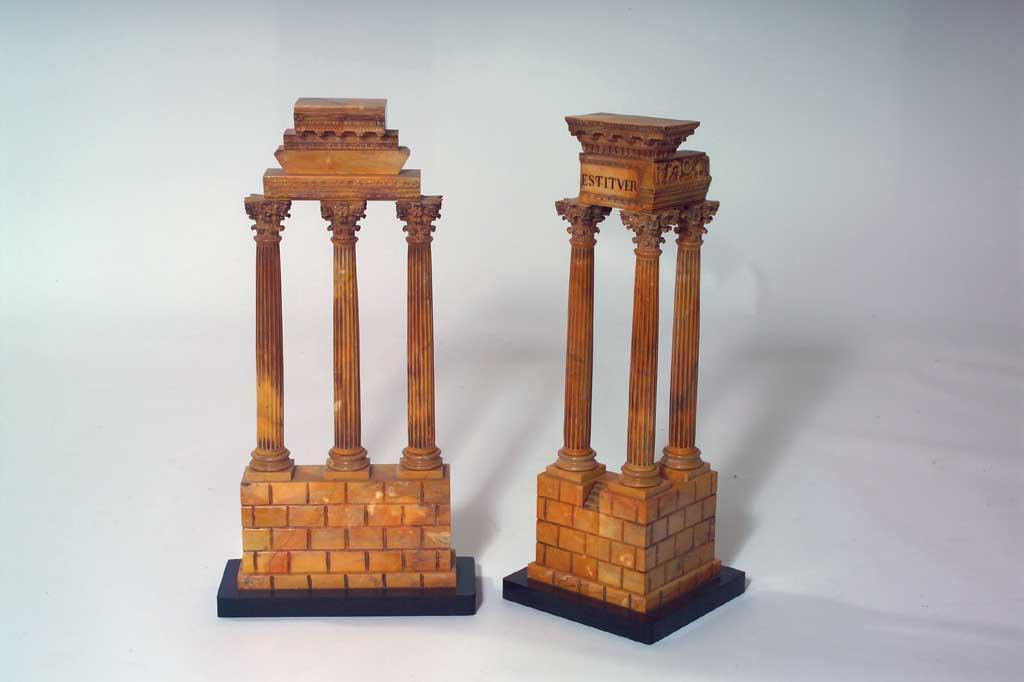 Two Sienna marble models, the Temples of Castor and Vespasian, on black marble base, 52.5cm (20.75in) high. (2)