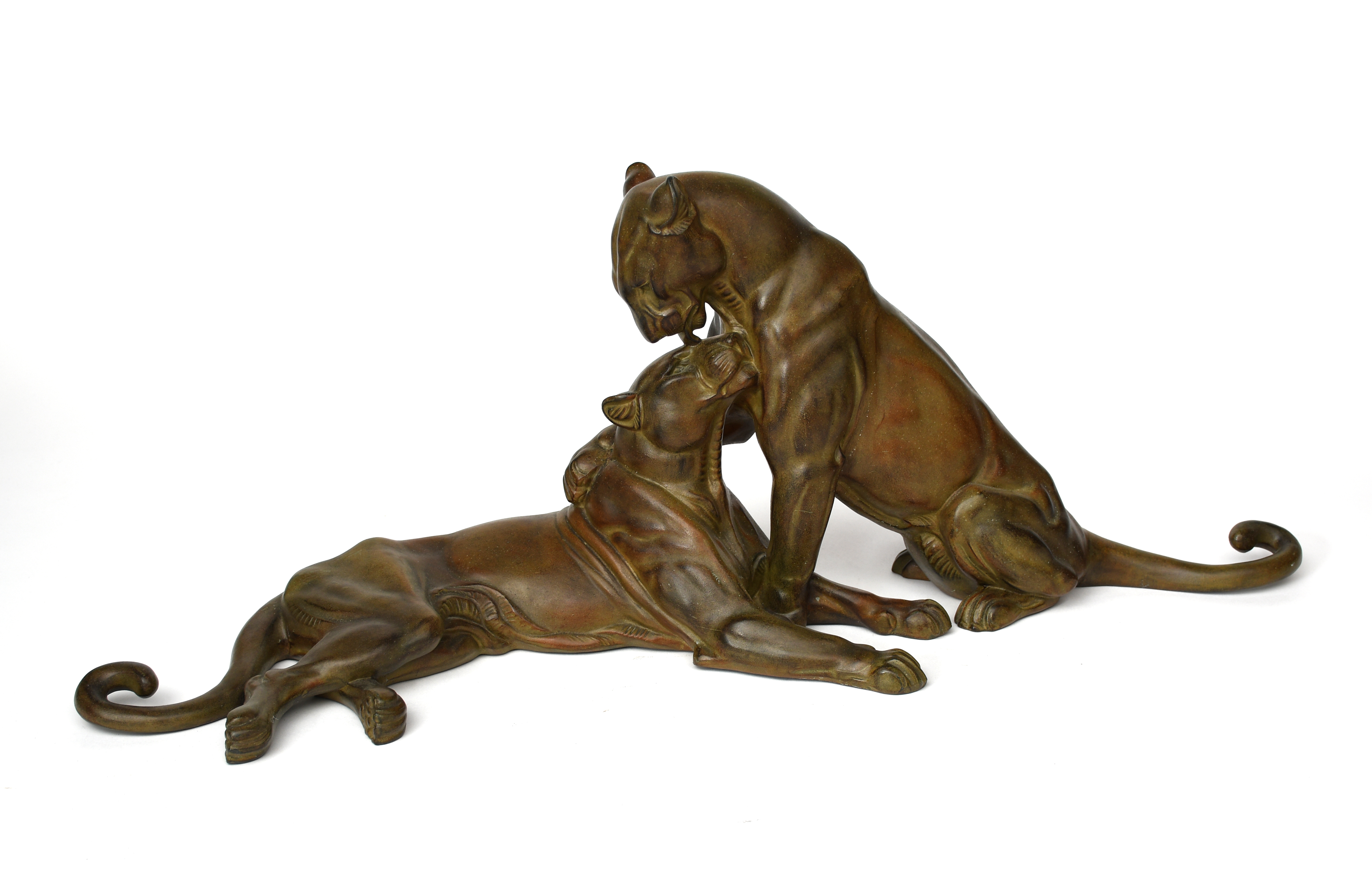 A patinated spelter model of two resting panthers, one lying down, the other sitting and preening,