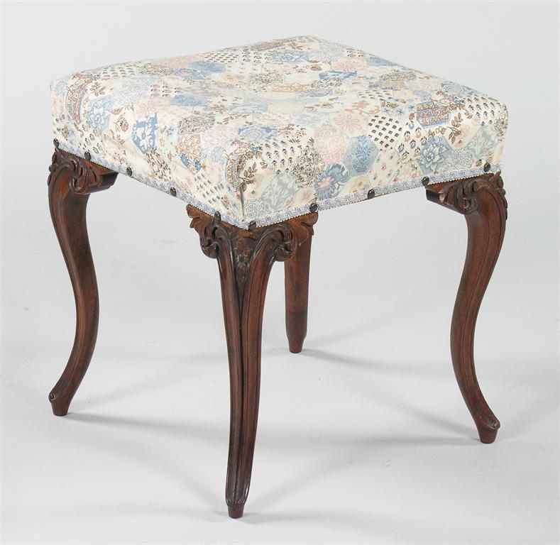 A George IV square stool, the later covered seat on carved rosewood cabriole legs with leaf brackets, the frame stamped ' MILES & EDWARDS 134 OXFORD ST, LONDON 1004 ', and ' TC' , 17in (43cm) h, 15.25in (38.6cm) w.