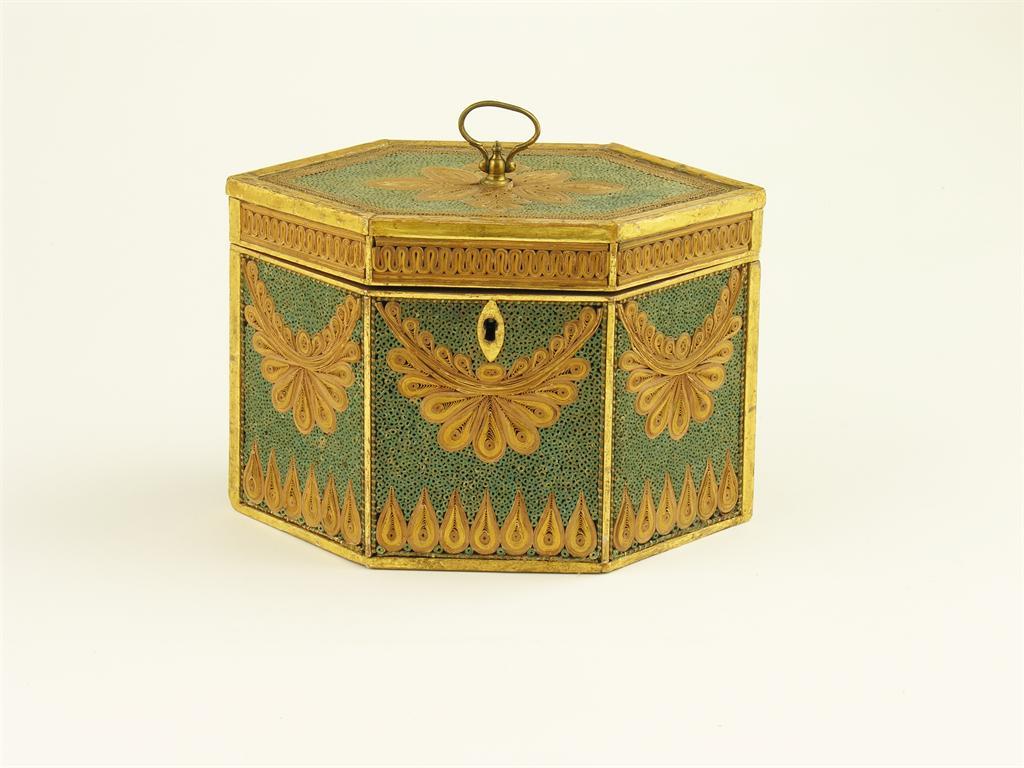 A George III rolled paper hexagonal tea caddy, the panels decorated with gilt swag tear drops within a green ground, the hinged top with a brass loop handle, the inner lid with yewwood oval panel and turned ivory handle with a divided interior, 15cm (6in) high, 18.5cm (7.25in) wide.