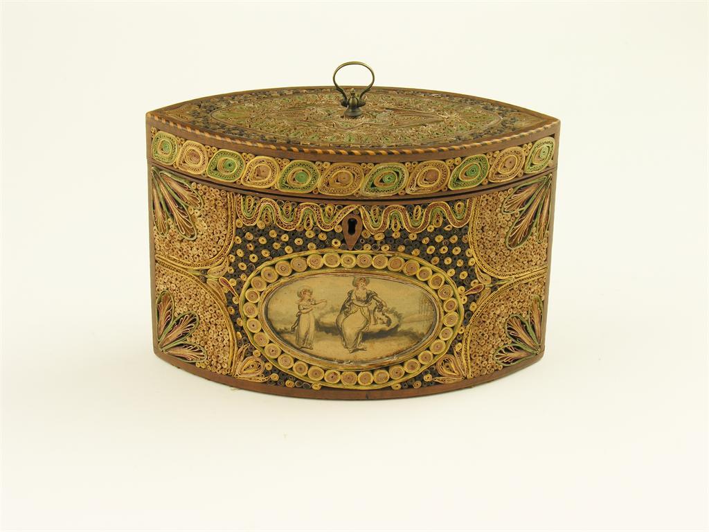 A George III rolled paper navette tea caddy, the front with an oval watercolour of a lady, a child and a dog within a surround of elaborate scrolls and flowers, in various colours, the hinged chequer strung top with brass loop handle and brightly coloured rolled paper interior, the inner lid with inlaid yewwood panel and a brass handle, 14cm (5.5in) high, 19cm (7.5in) wide.