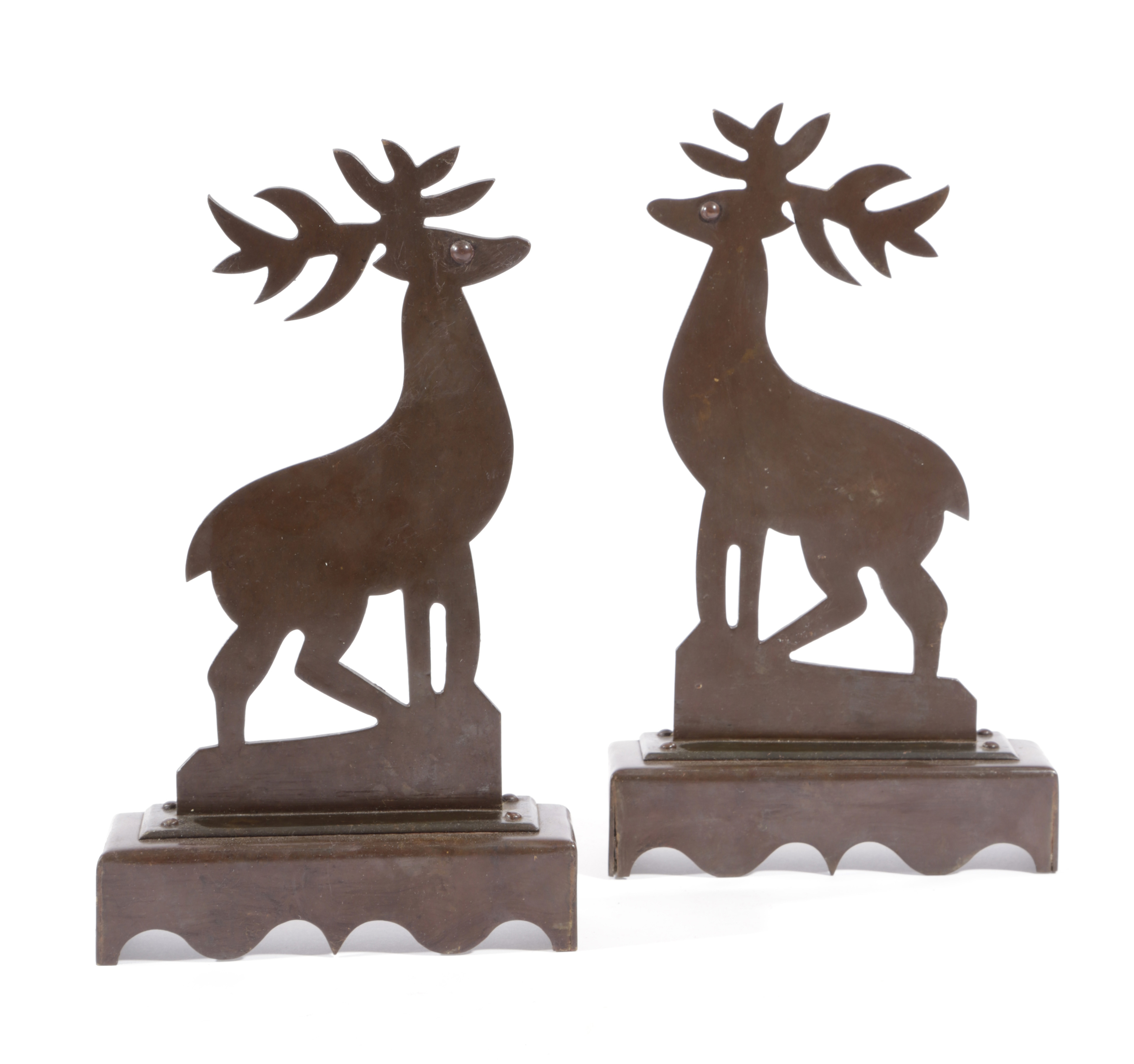 A PAIR OF FOLK ART BRONZED STAG CHIMNEY ORNAMENTS